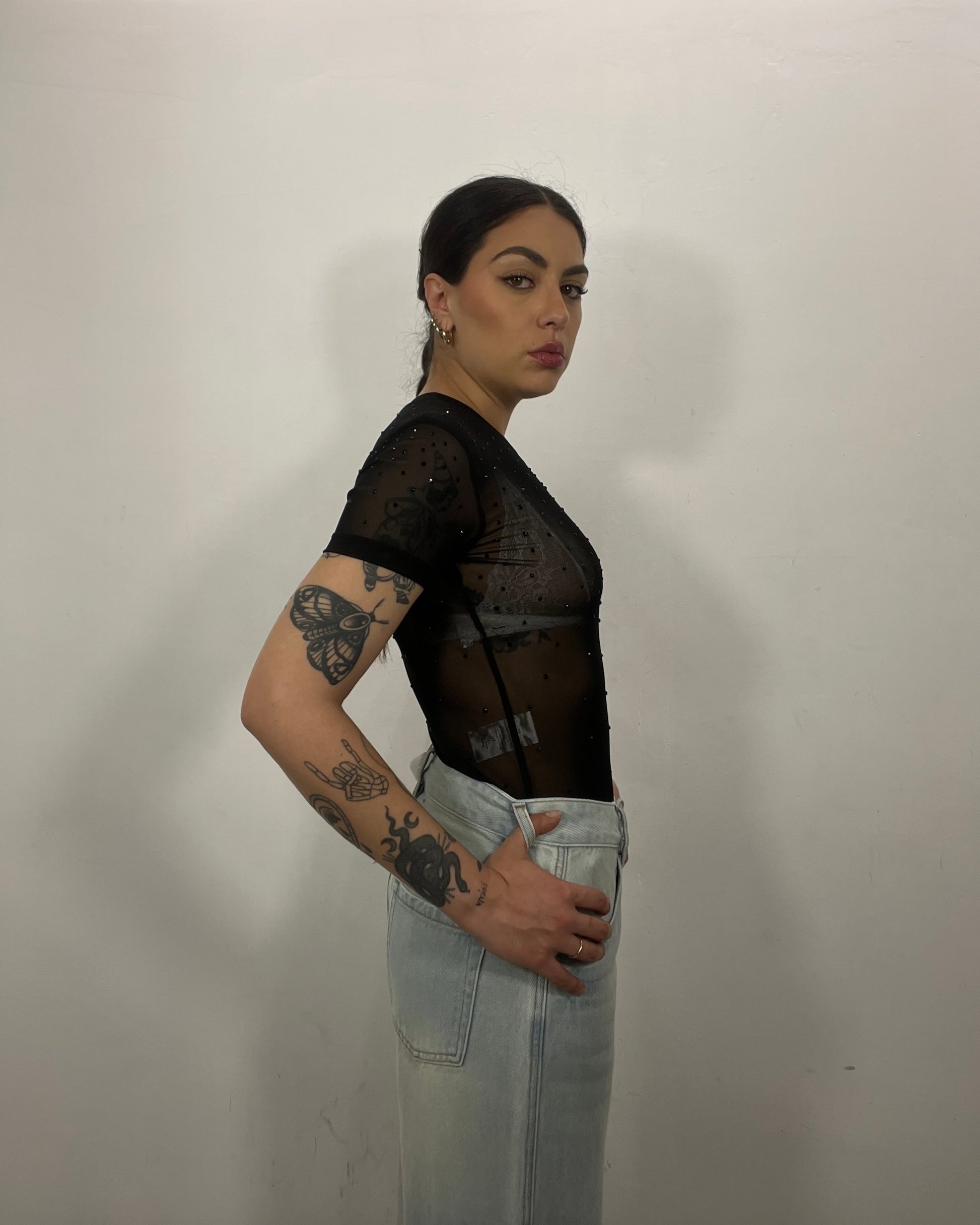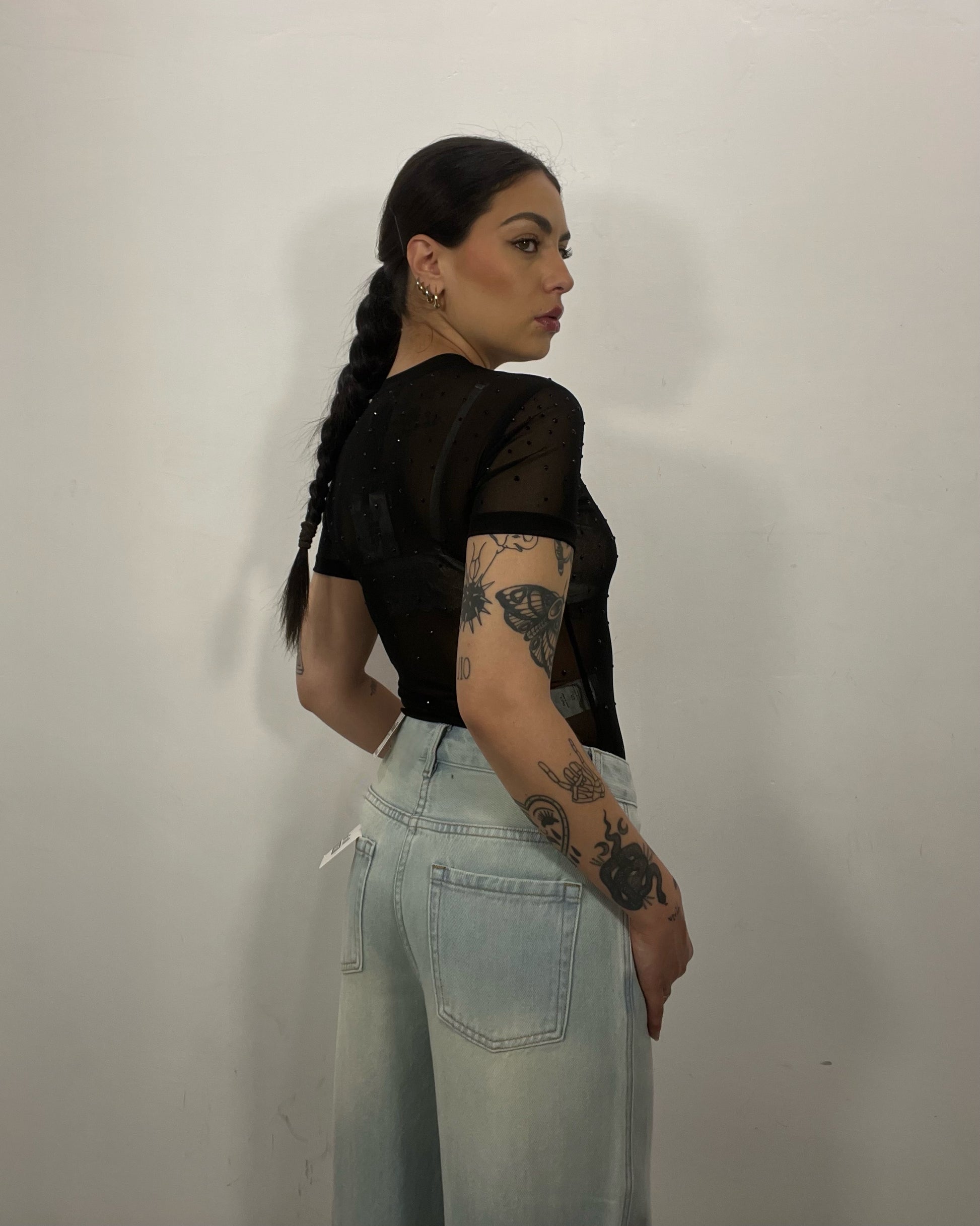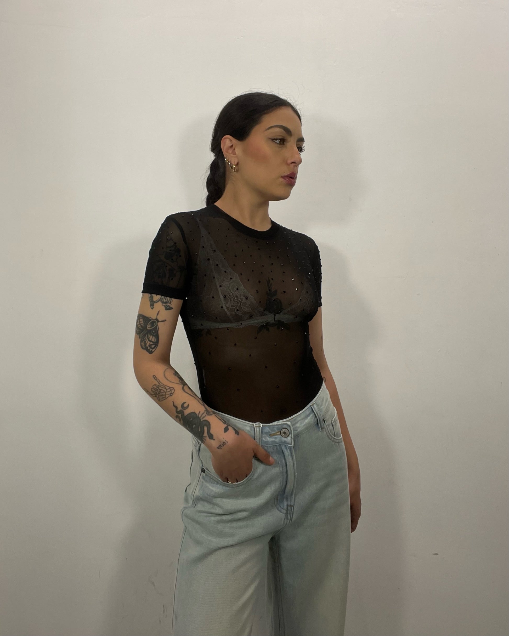 Body in tulle a manica corta con strass applicati dello stesso colore. Disponibile in taglia unica vestibilità Tg 38-44