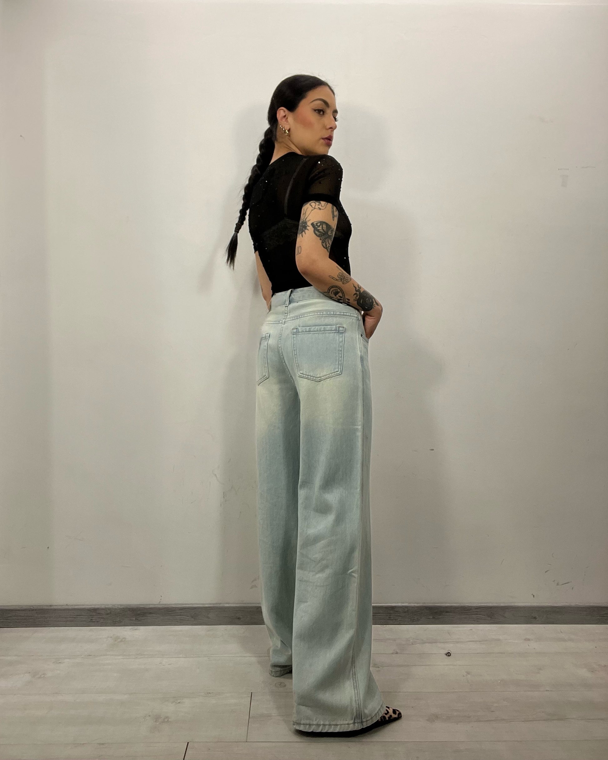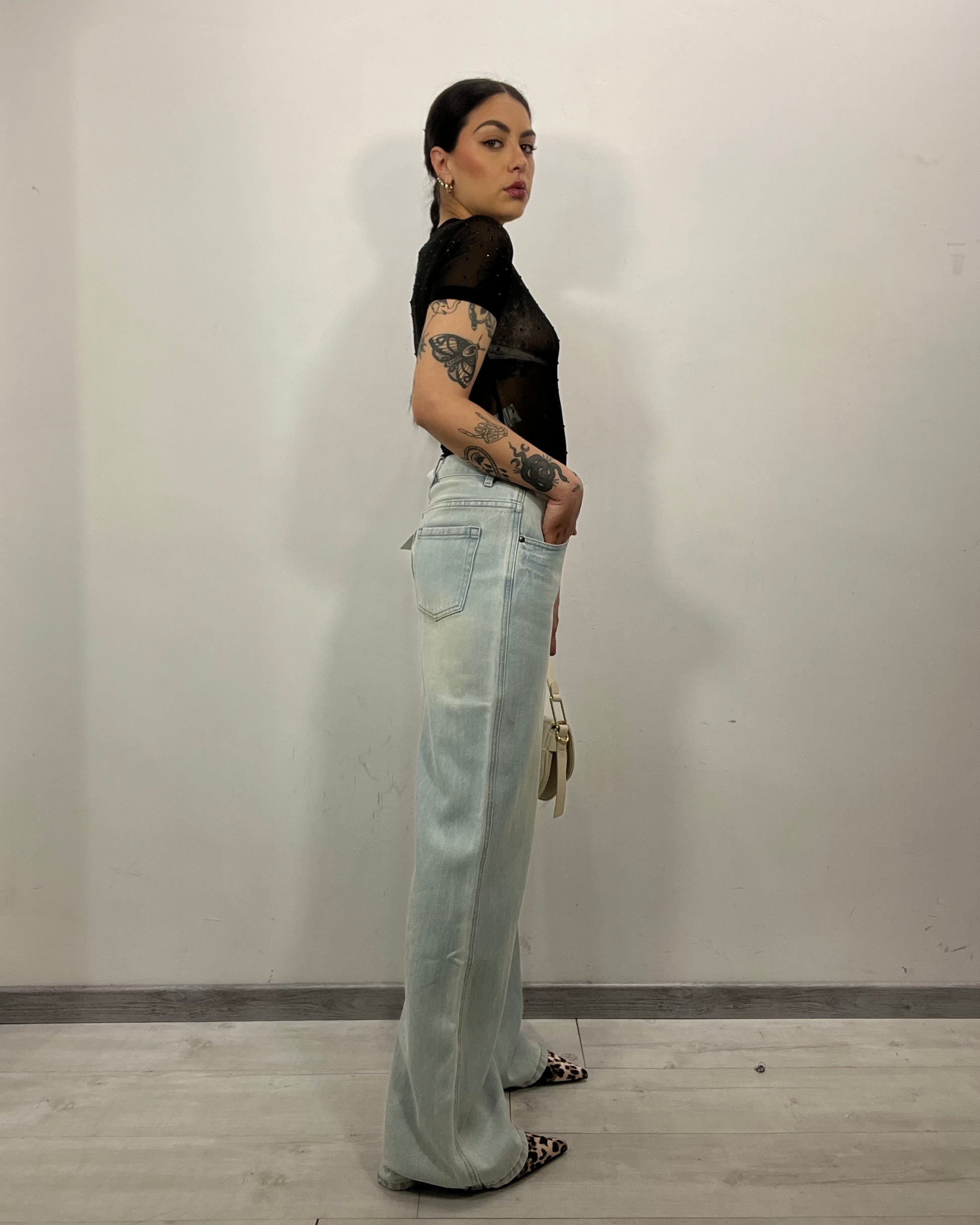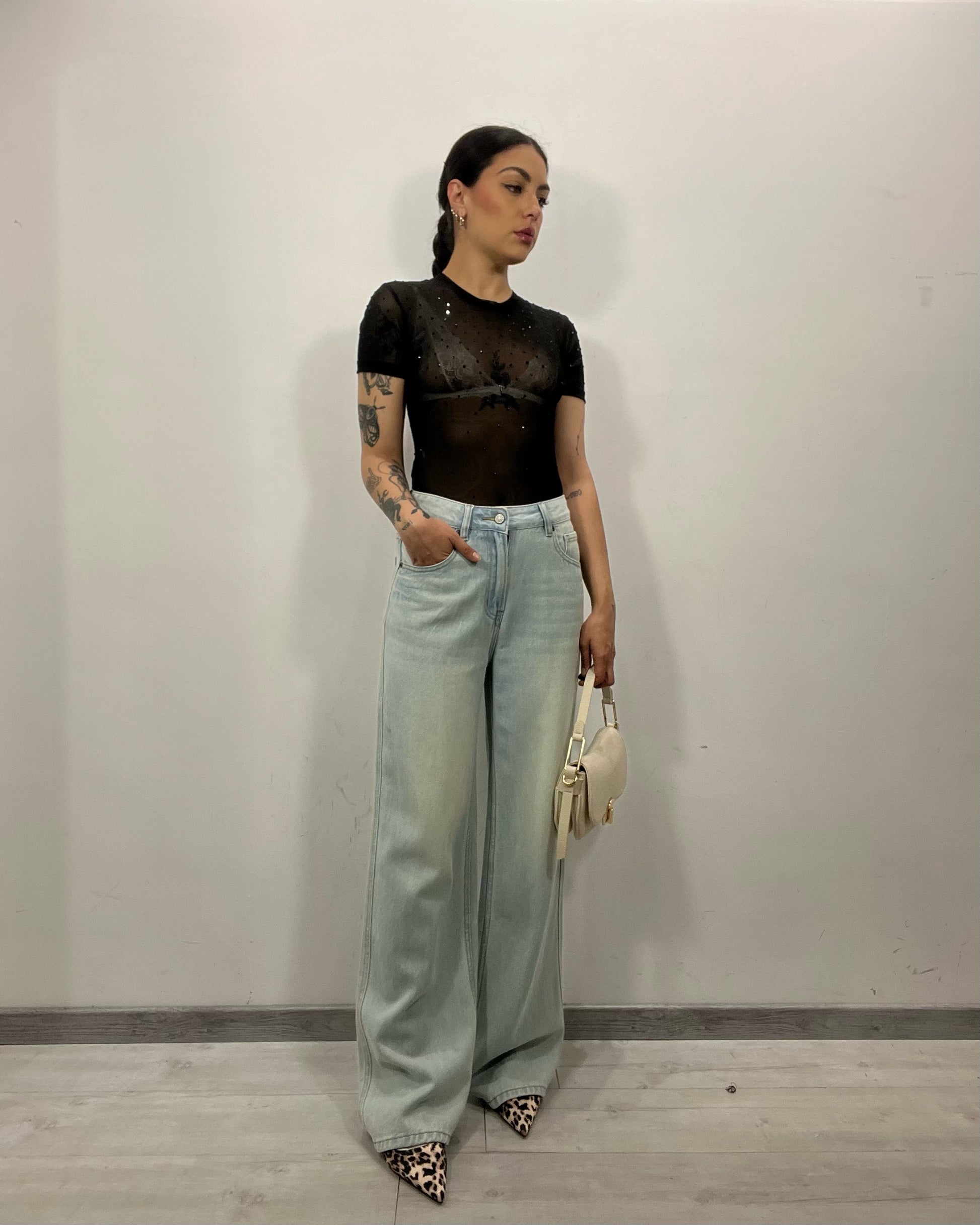Body in tulle a manica corta con strass applicati dello stesso colore. Disponibile in taglia unica vestibilità Tg 38-44