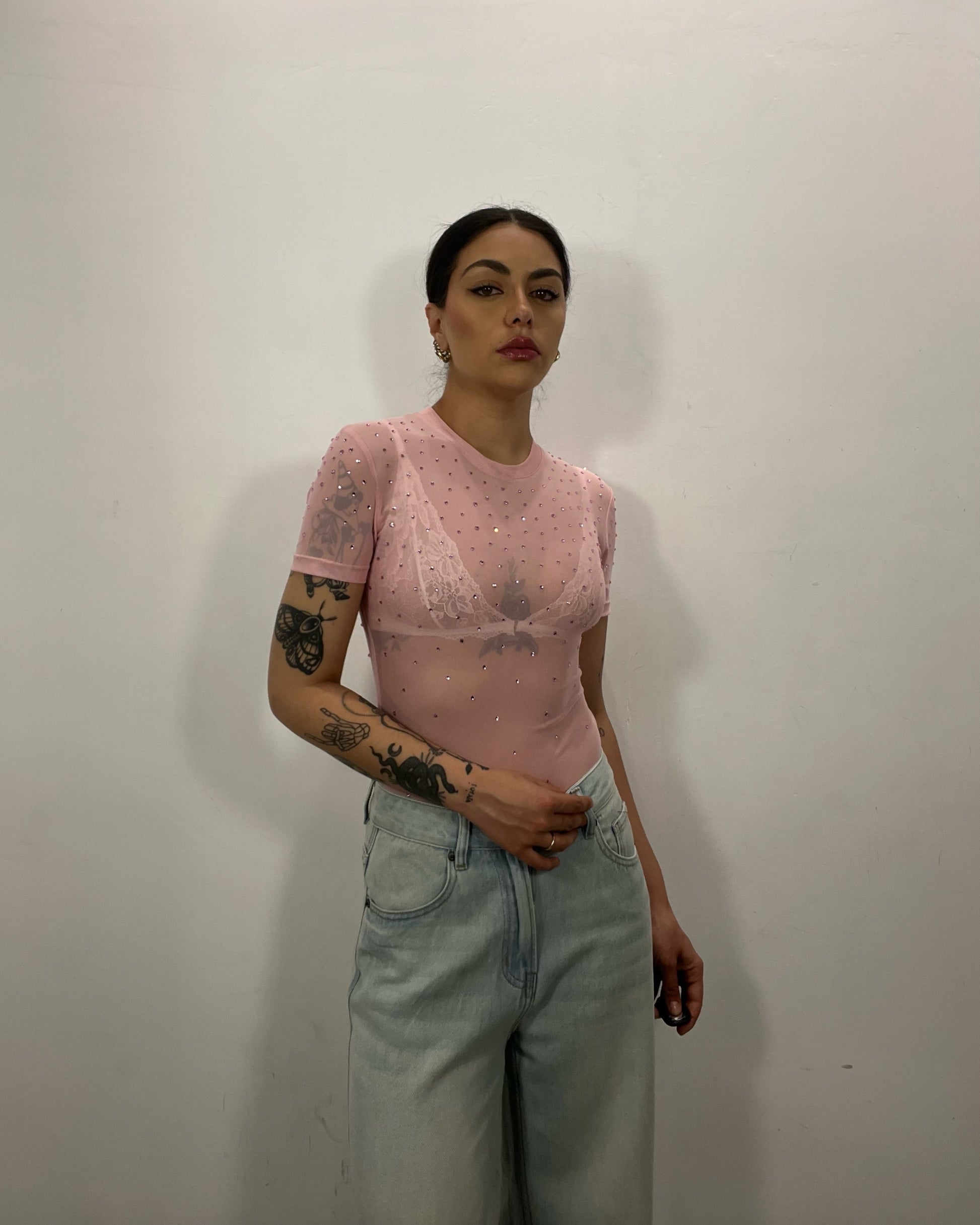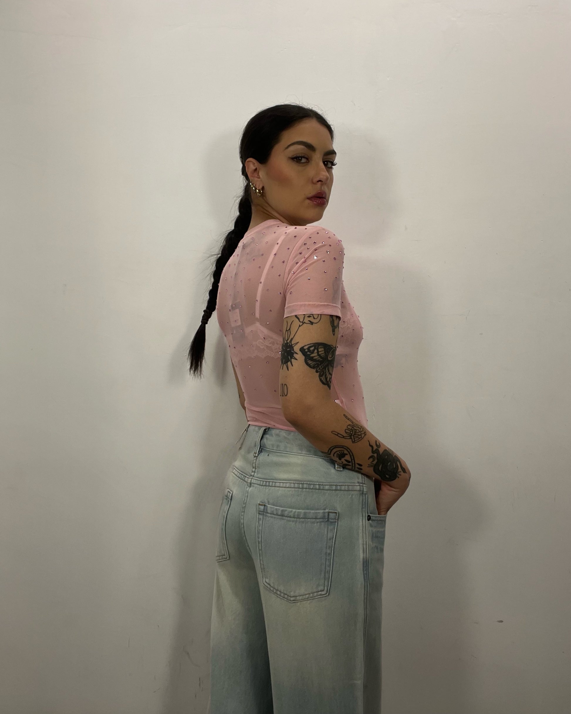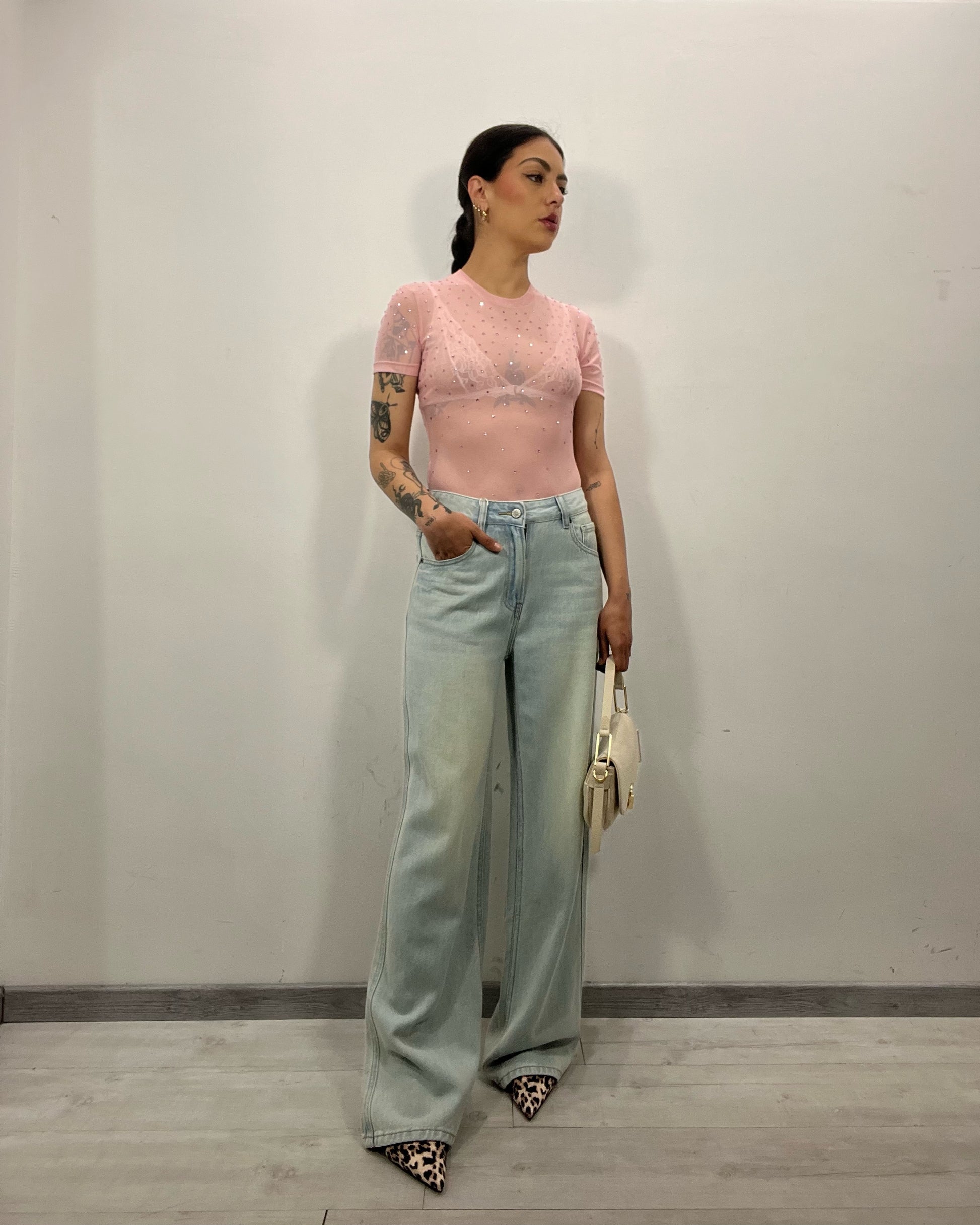Body in tulle a manica corta con strass applicati dello stesso colore. Disponibile in taglia unica vestibilità Tg 38-44