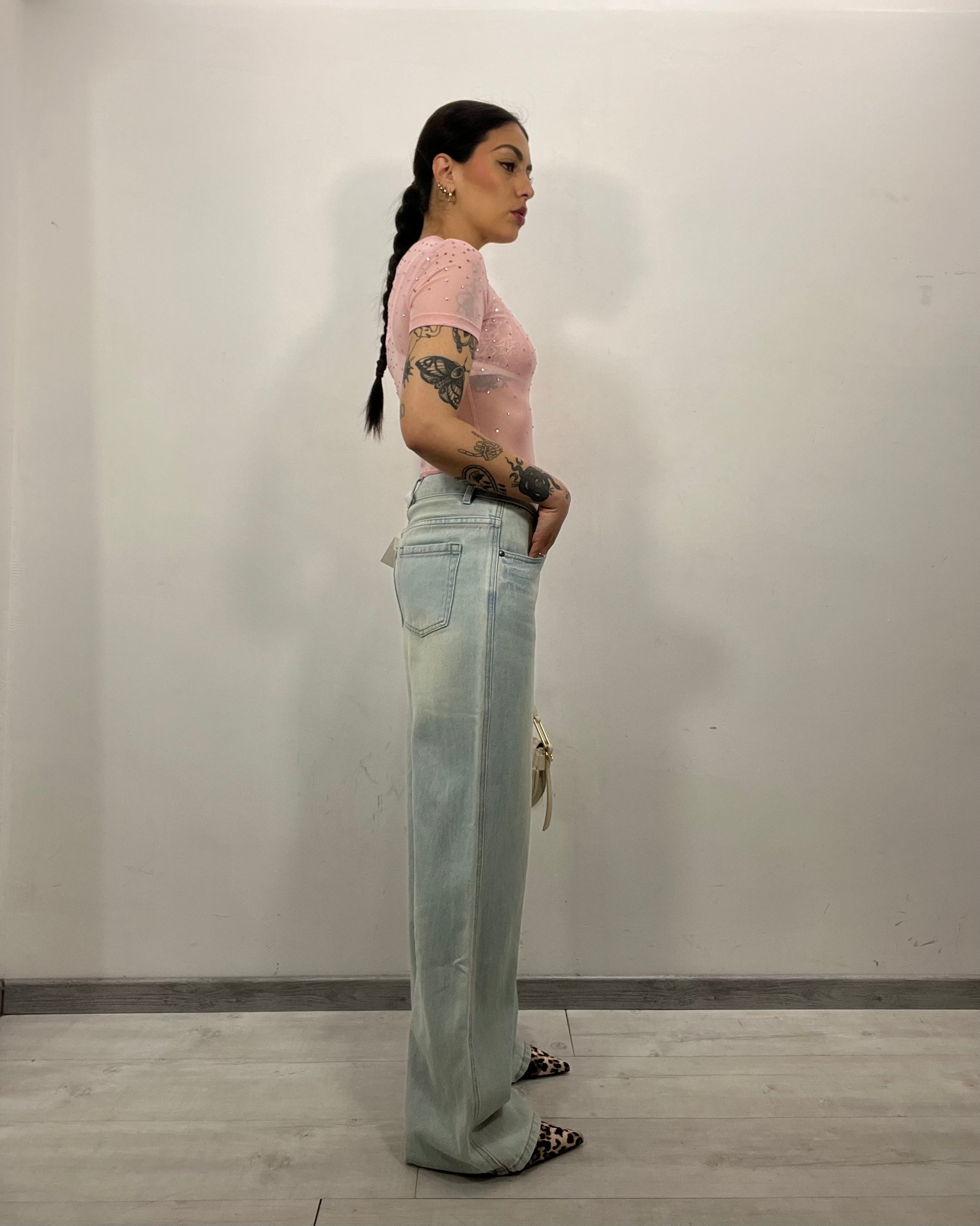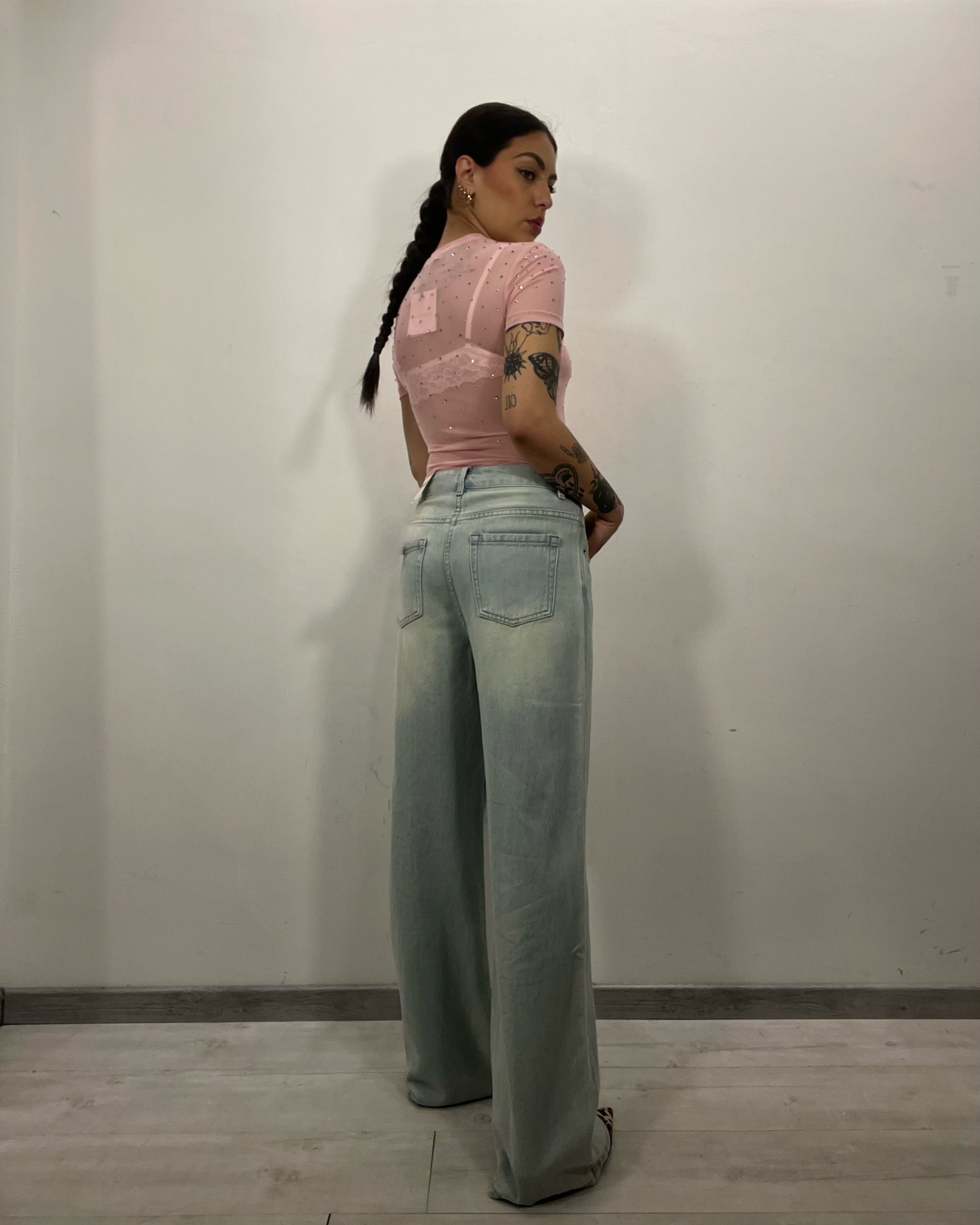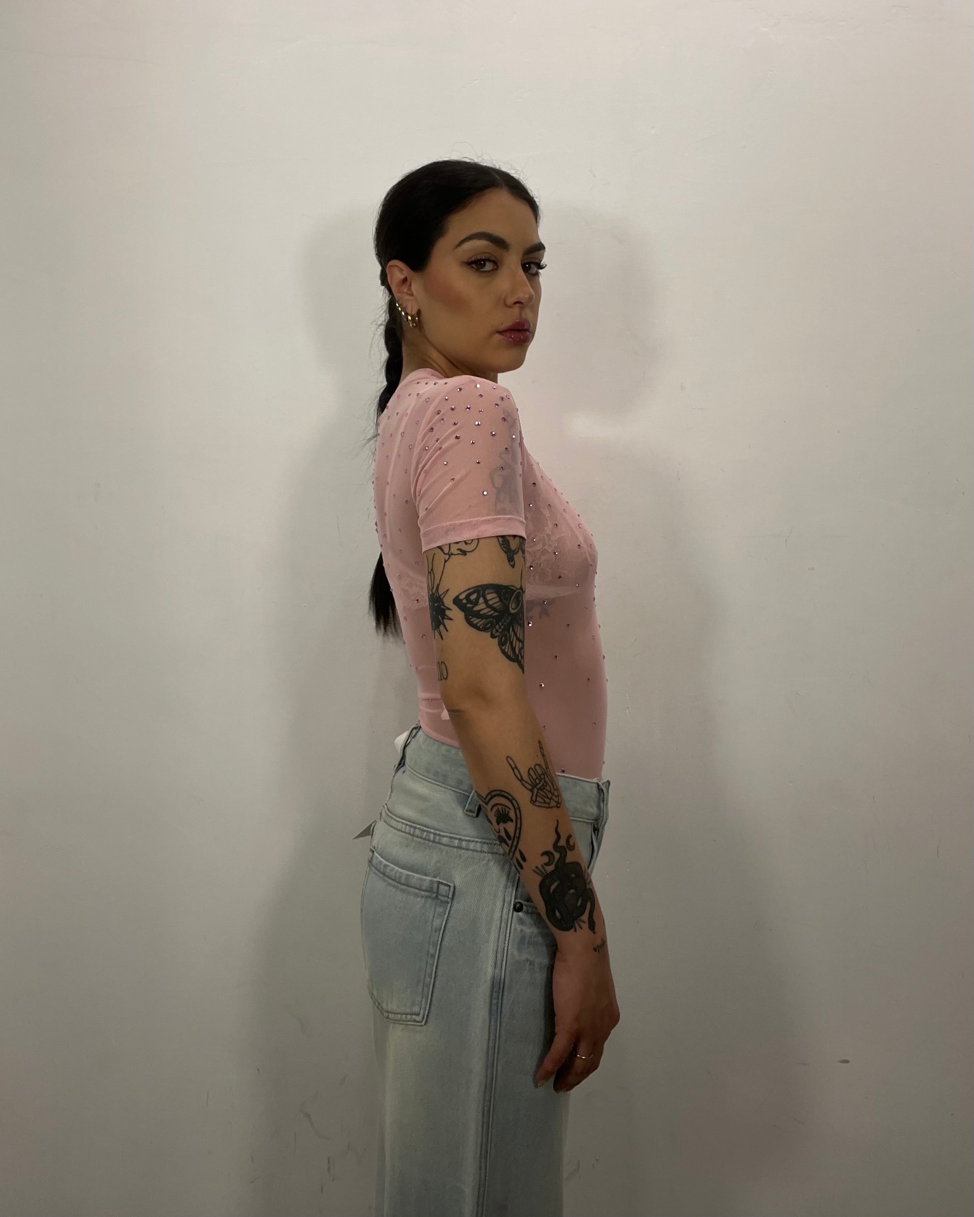 Body in tulle a manica corta con strass applicati dello stesso colore. Disponibile in taglia unica vestibilità Tg 38-44