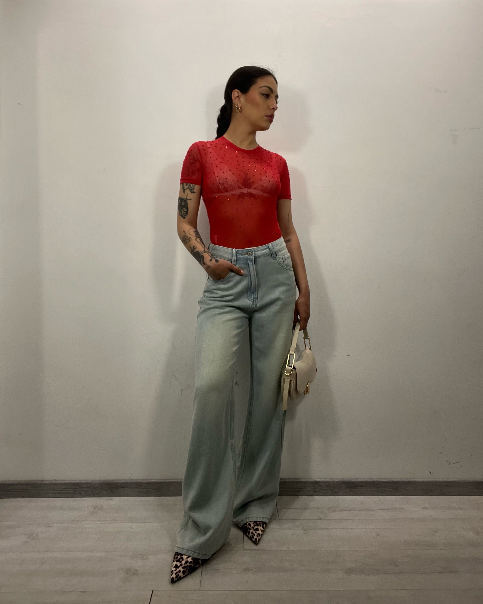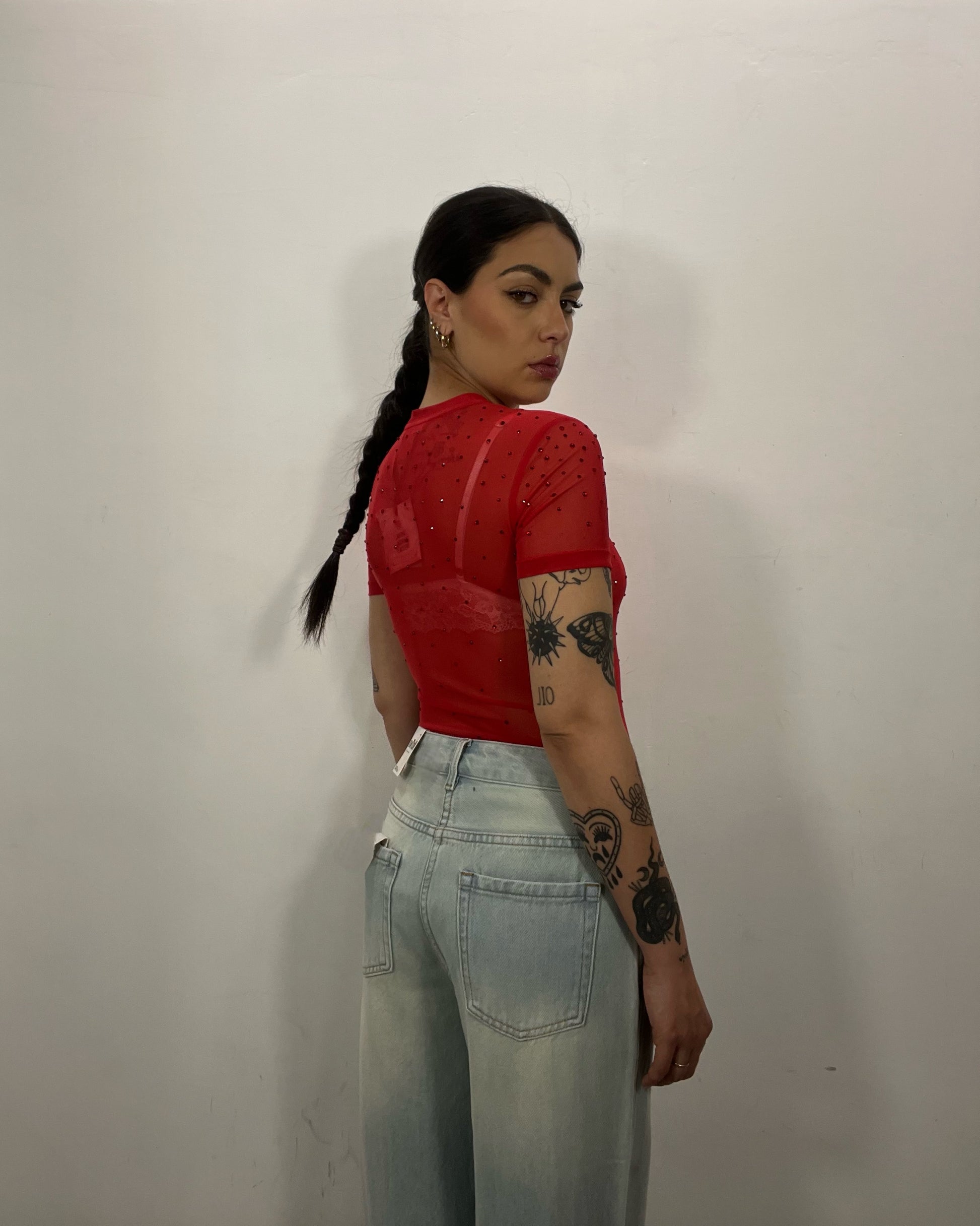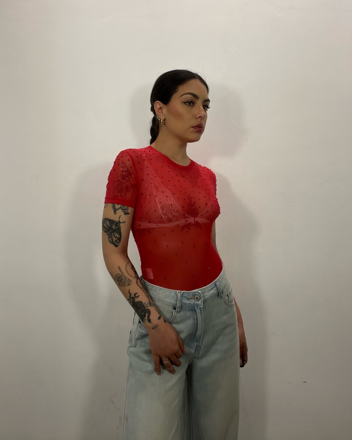 Body in tulle a manica corta con strass applicati dello stesso colore. Disponibile in taglia unica vestibilità Tg 38-44
