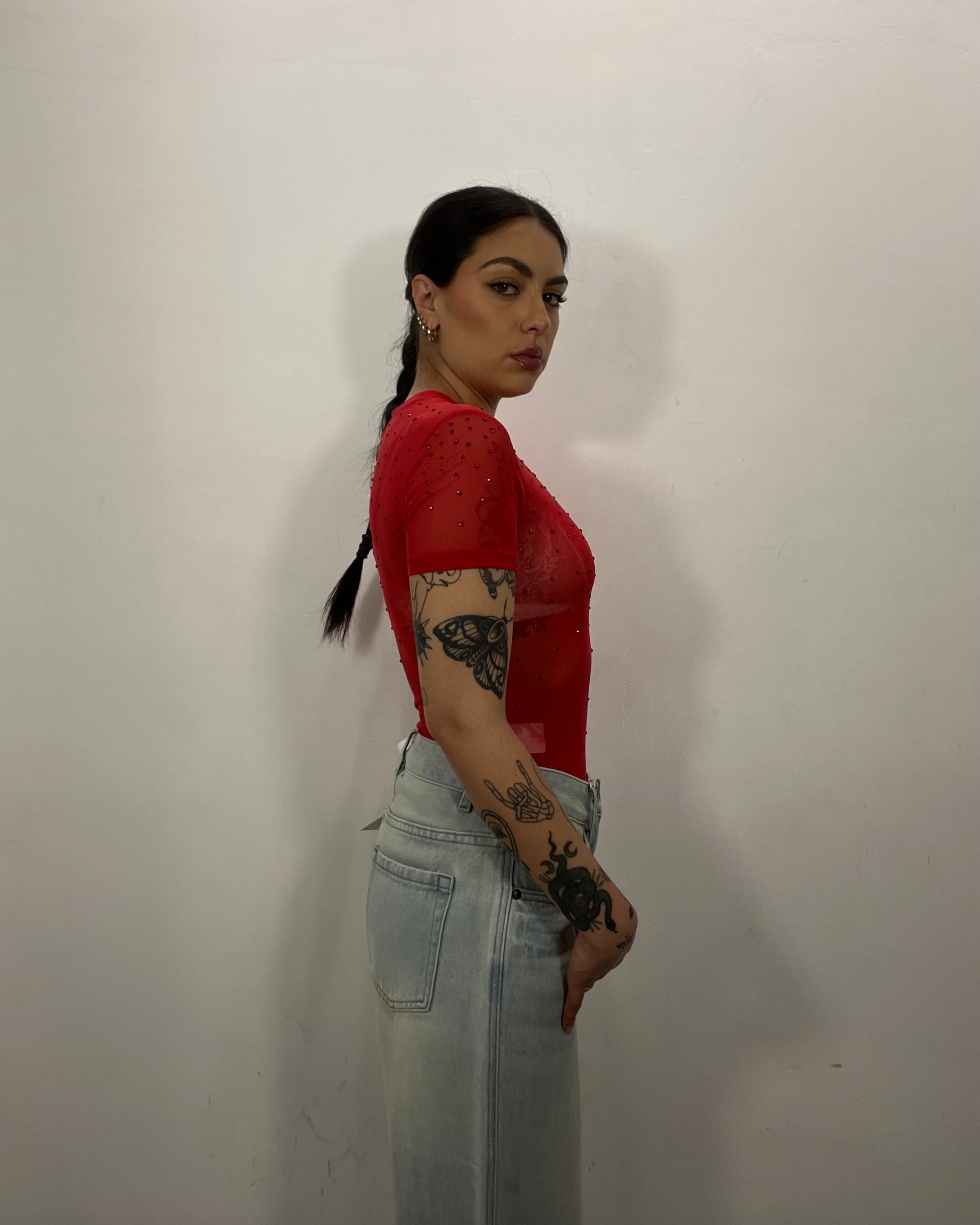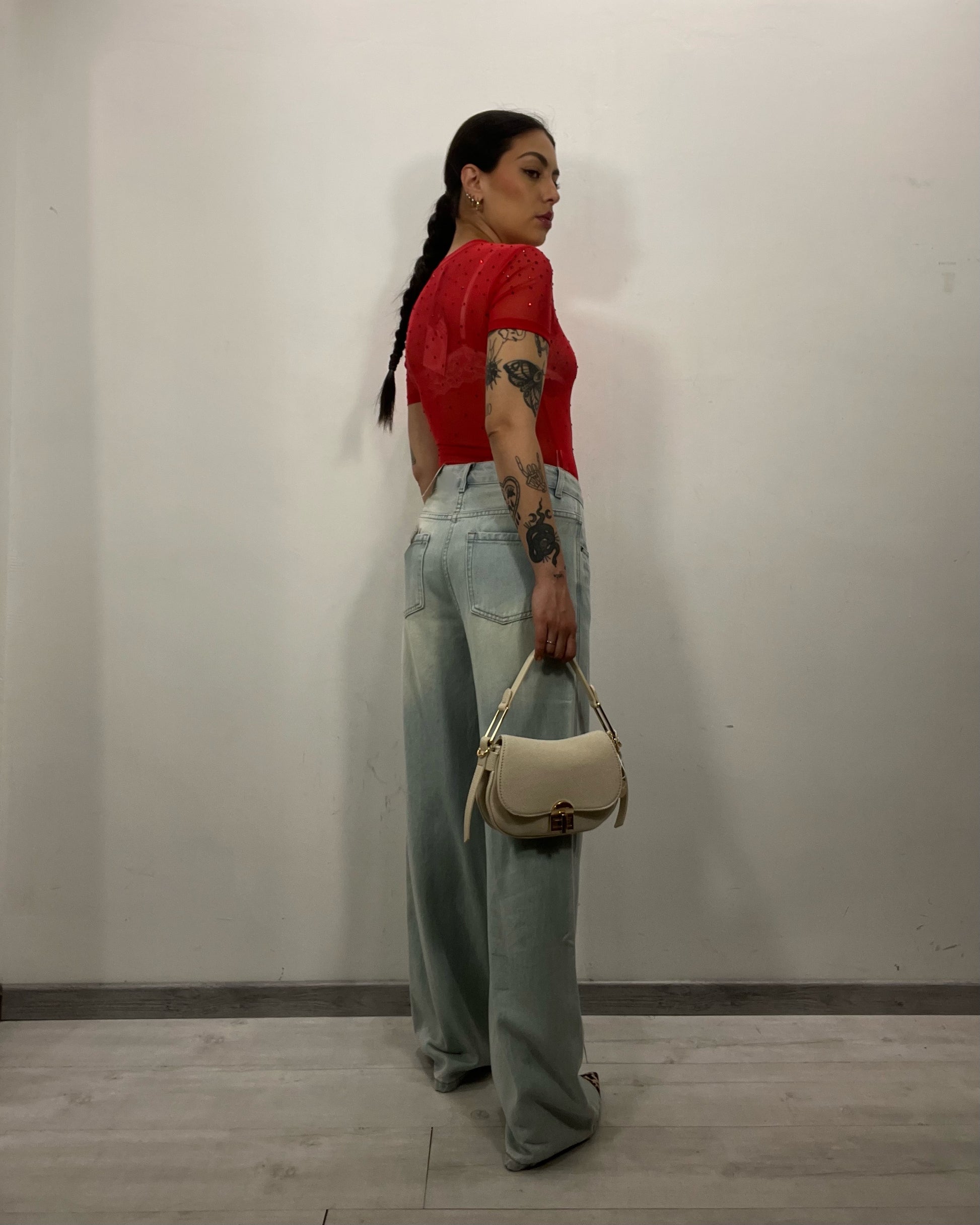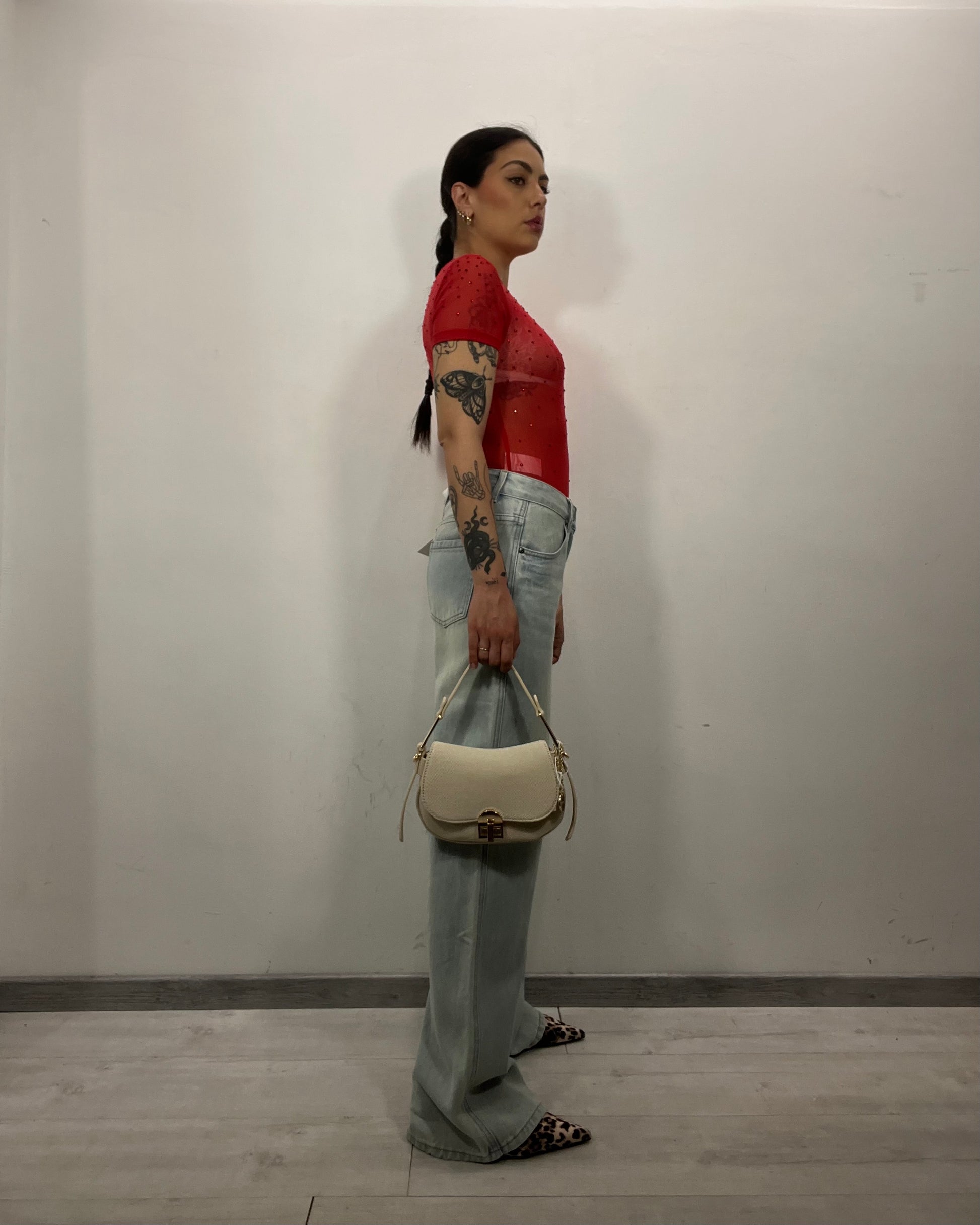 Body in tulle a manica corta con strass applicati dello stesso colore. Disponibile in taglia unica vestibilità Tg 38-44