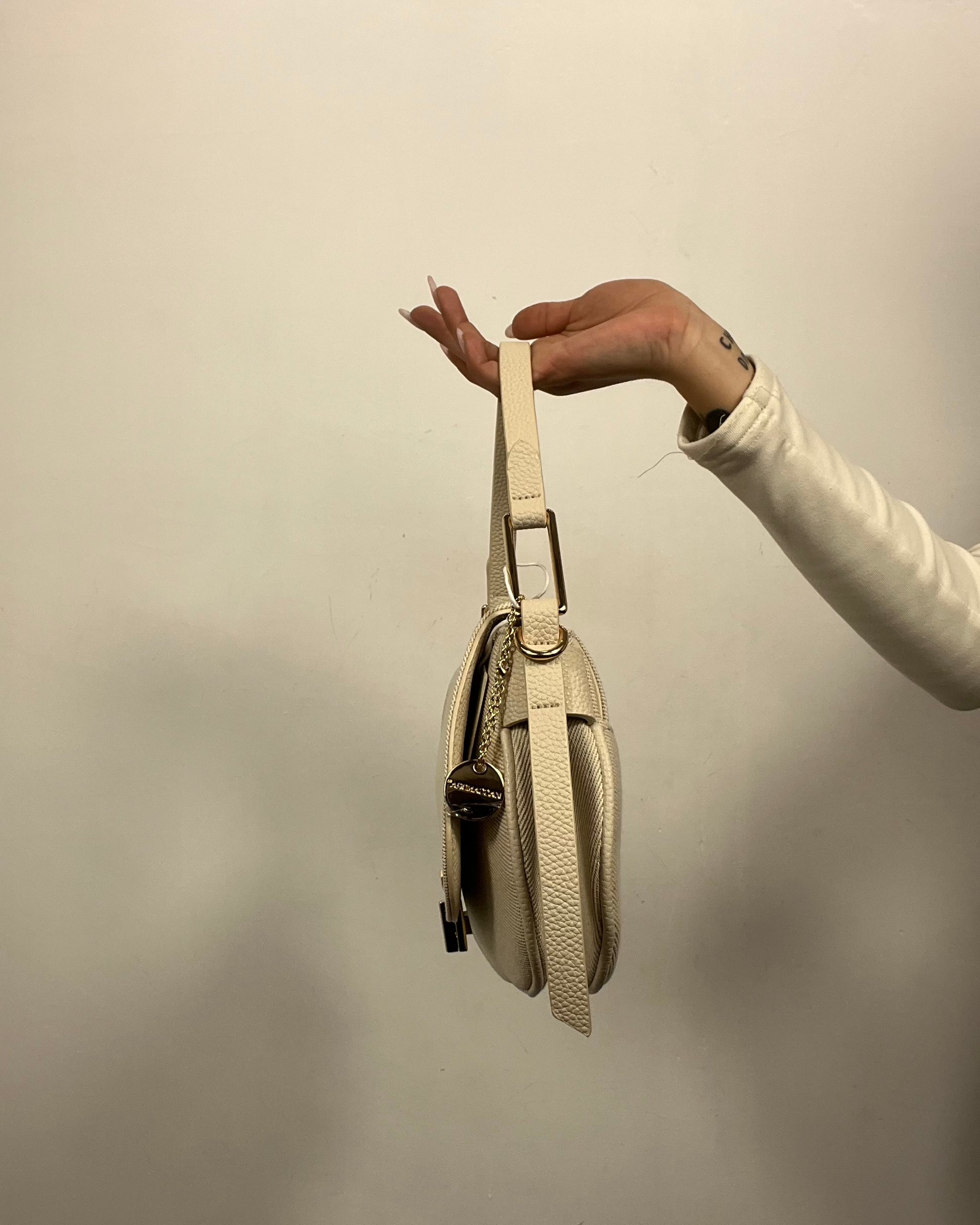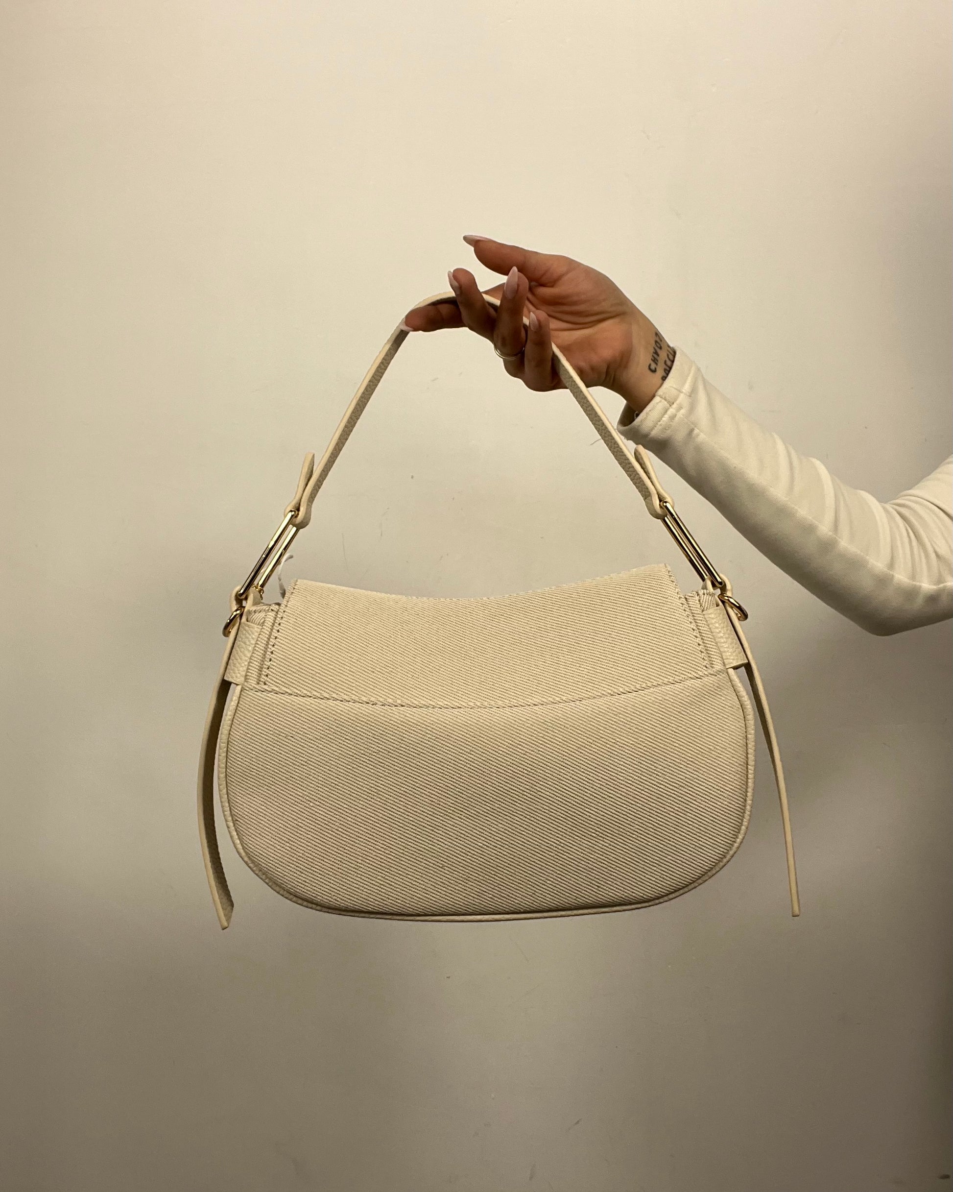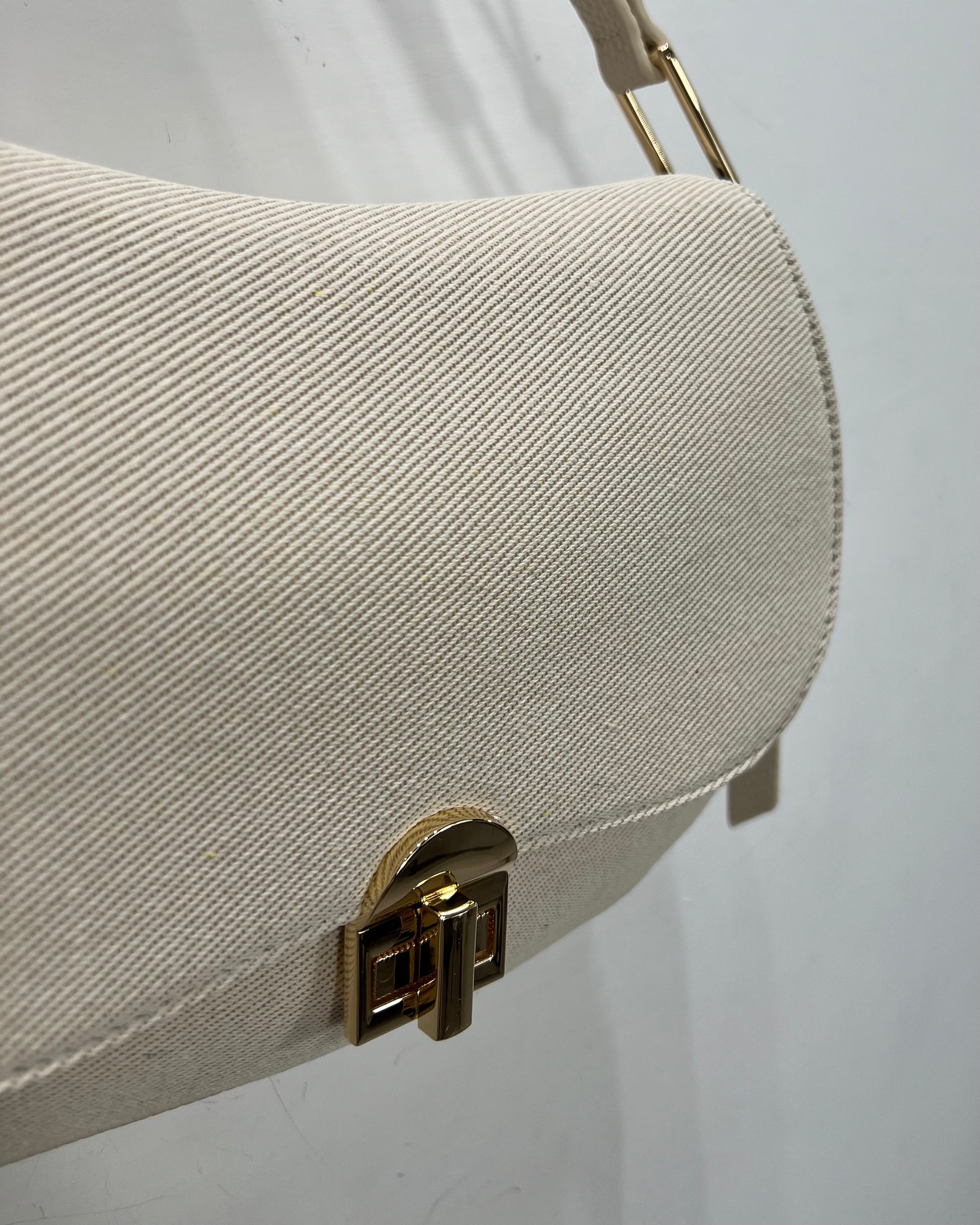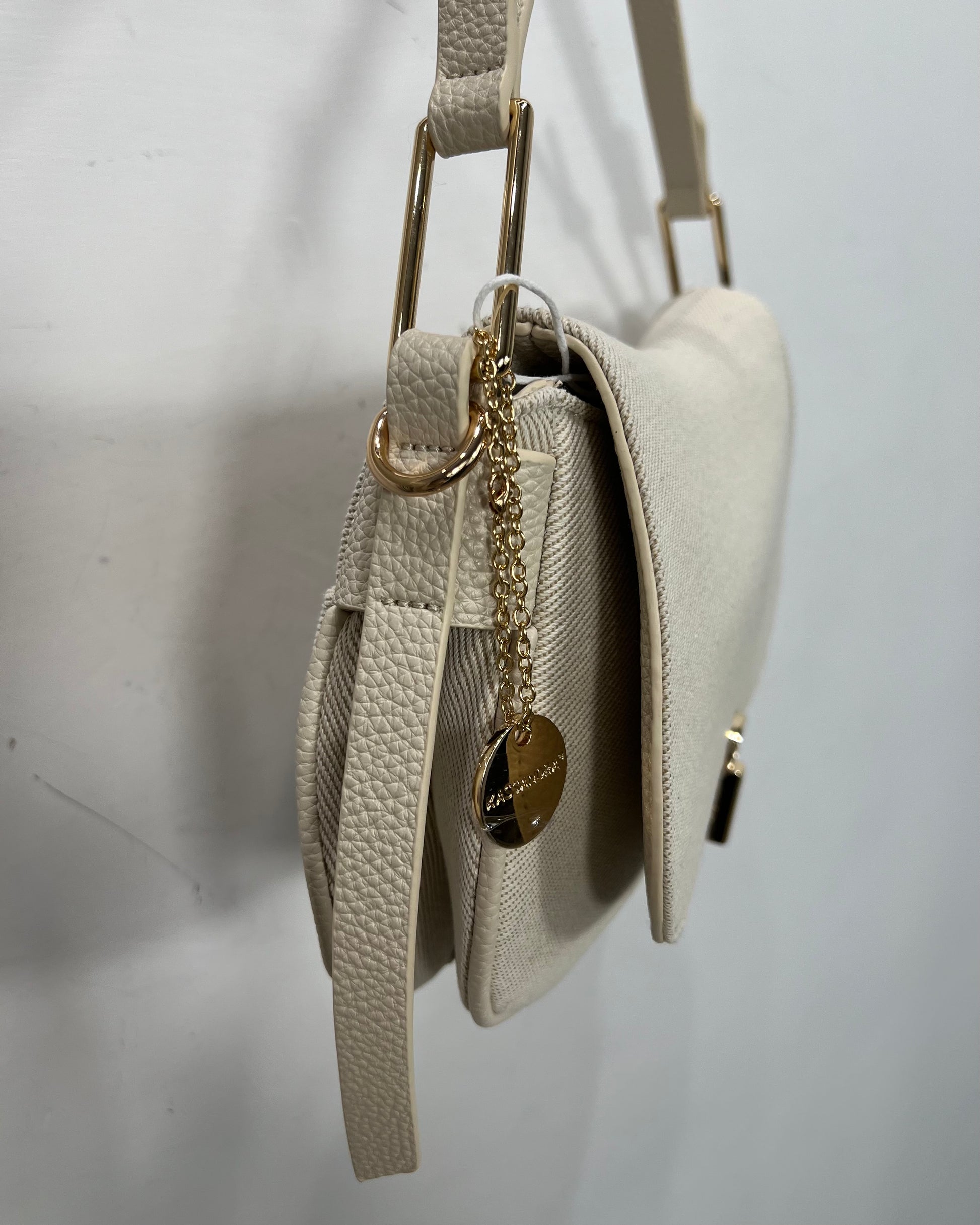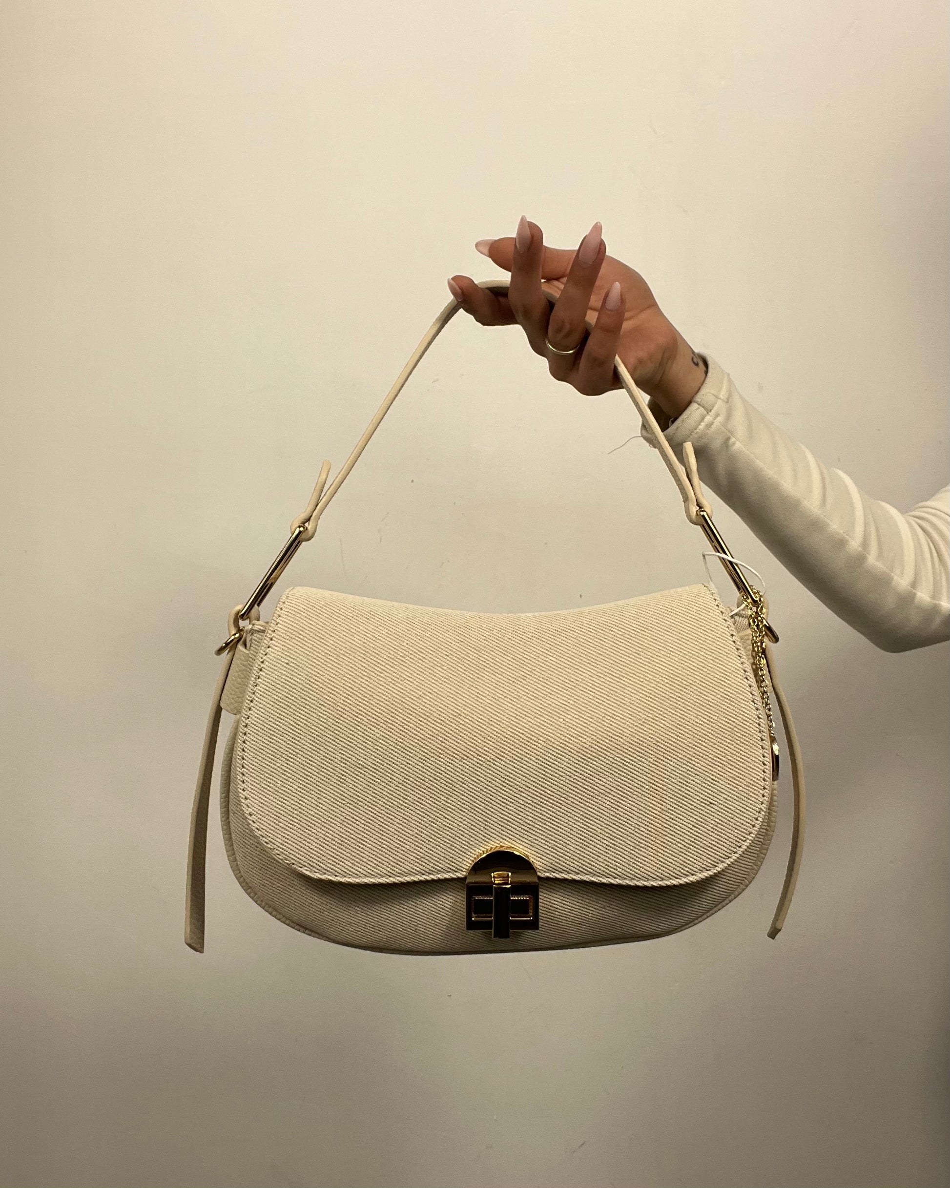 Borsa in tessuto ed ecopelle nei toni del panna e finiture metalliche oro