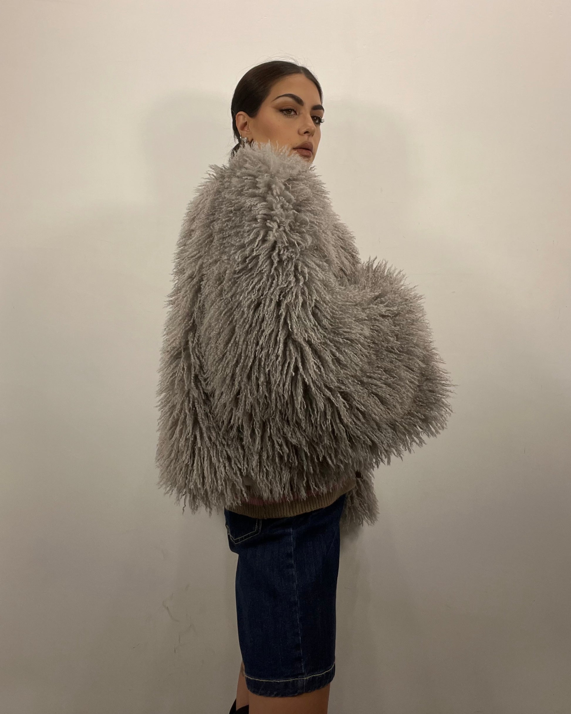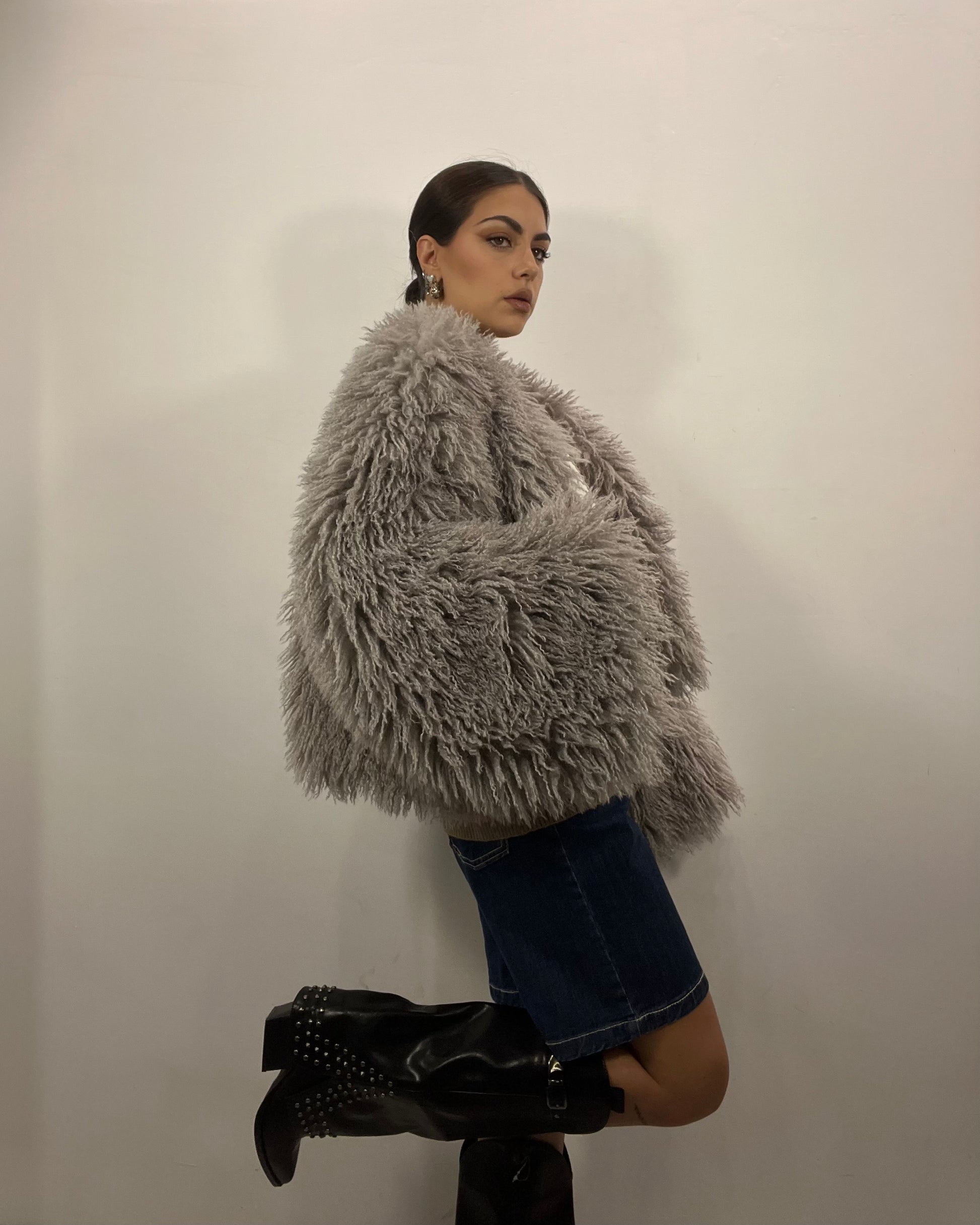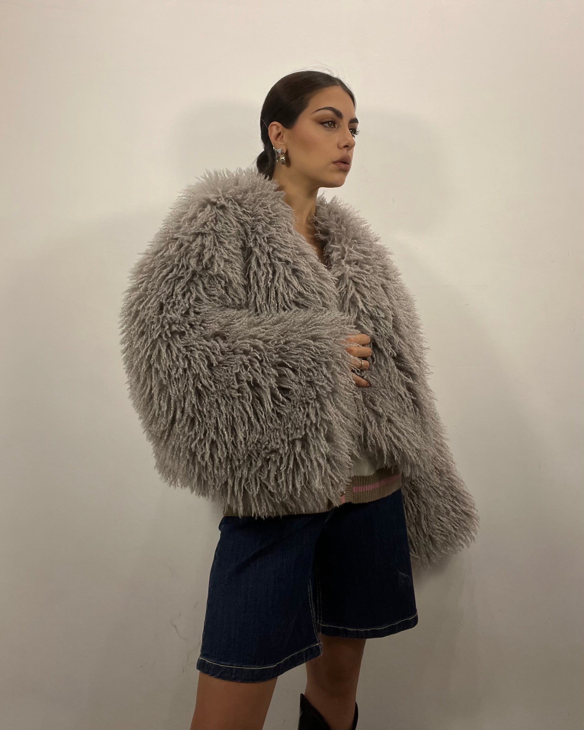 Eco pelliccia corta effetto frisé in grigio perla con manica svasata. Disponibile in taglia S/M e M/L