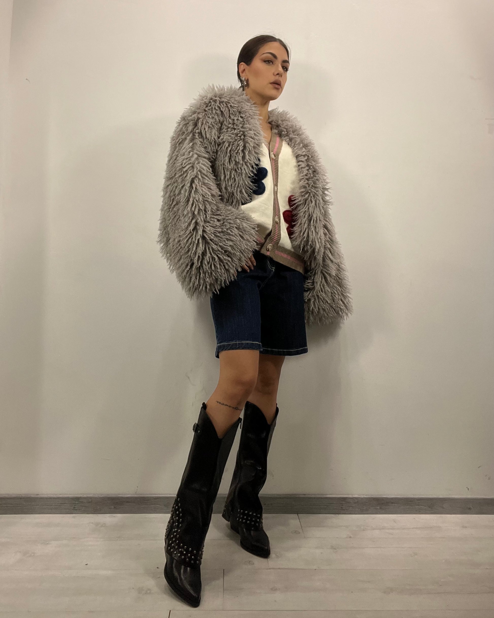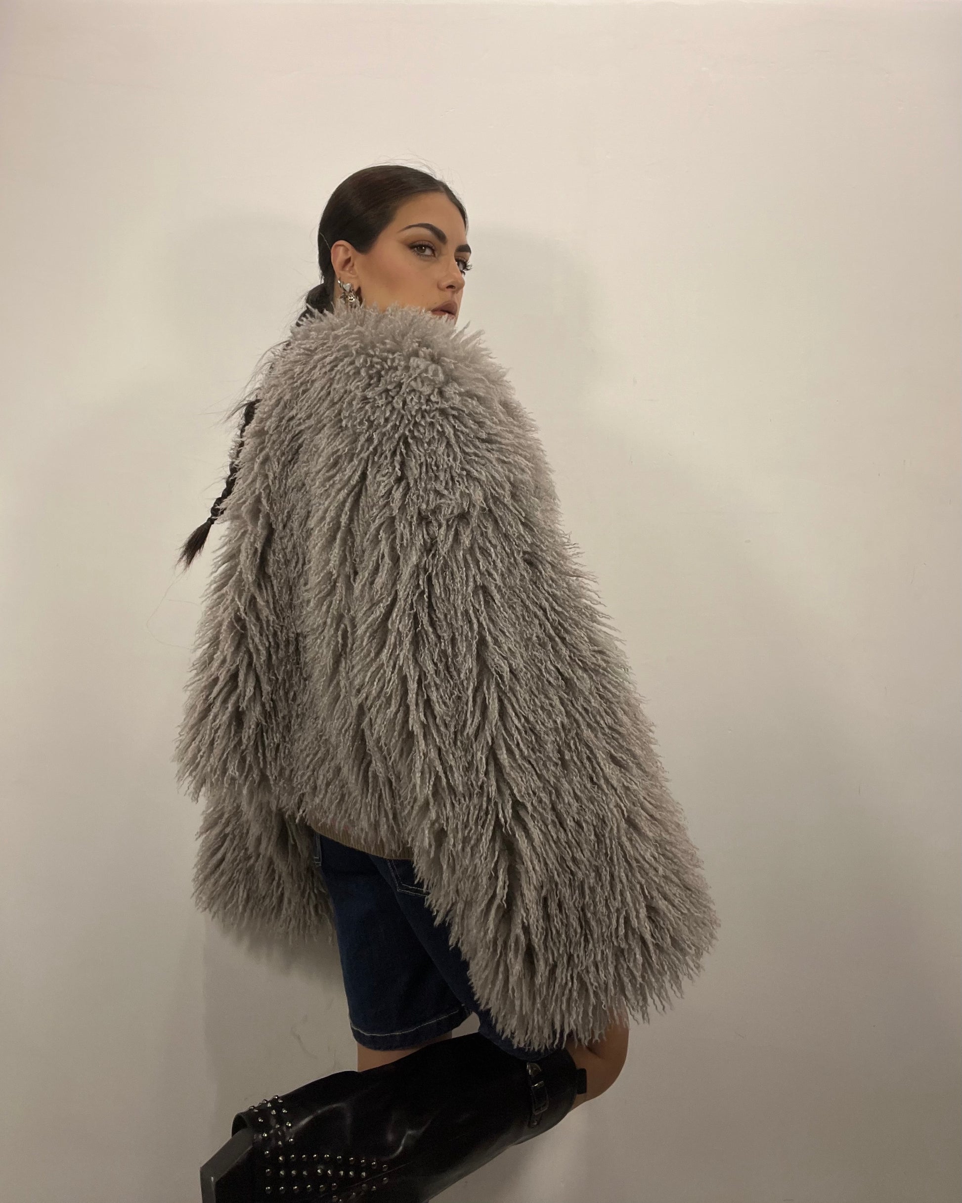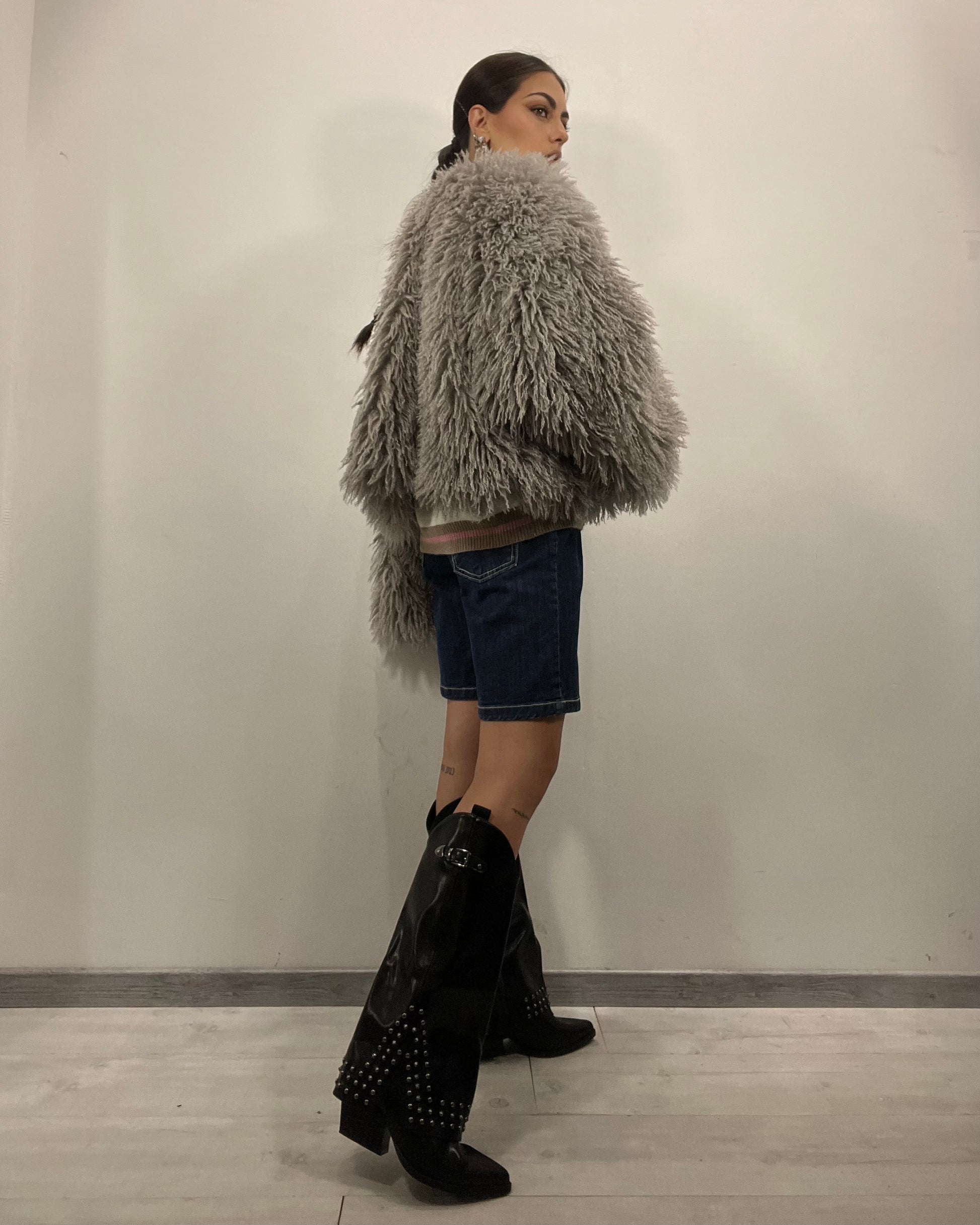 Eco pelliccia corta effetto frisé in grigio perla con manica svasata. Disponibile in taglia S/M e M/L