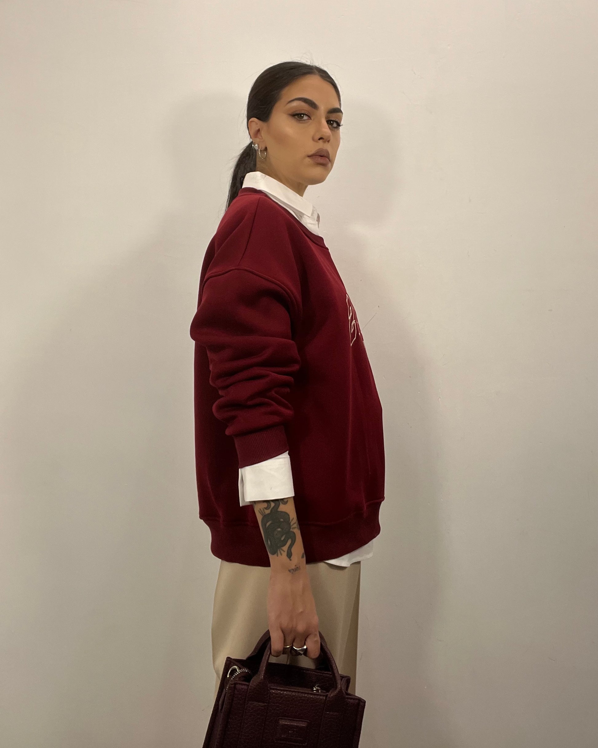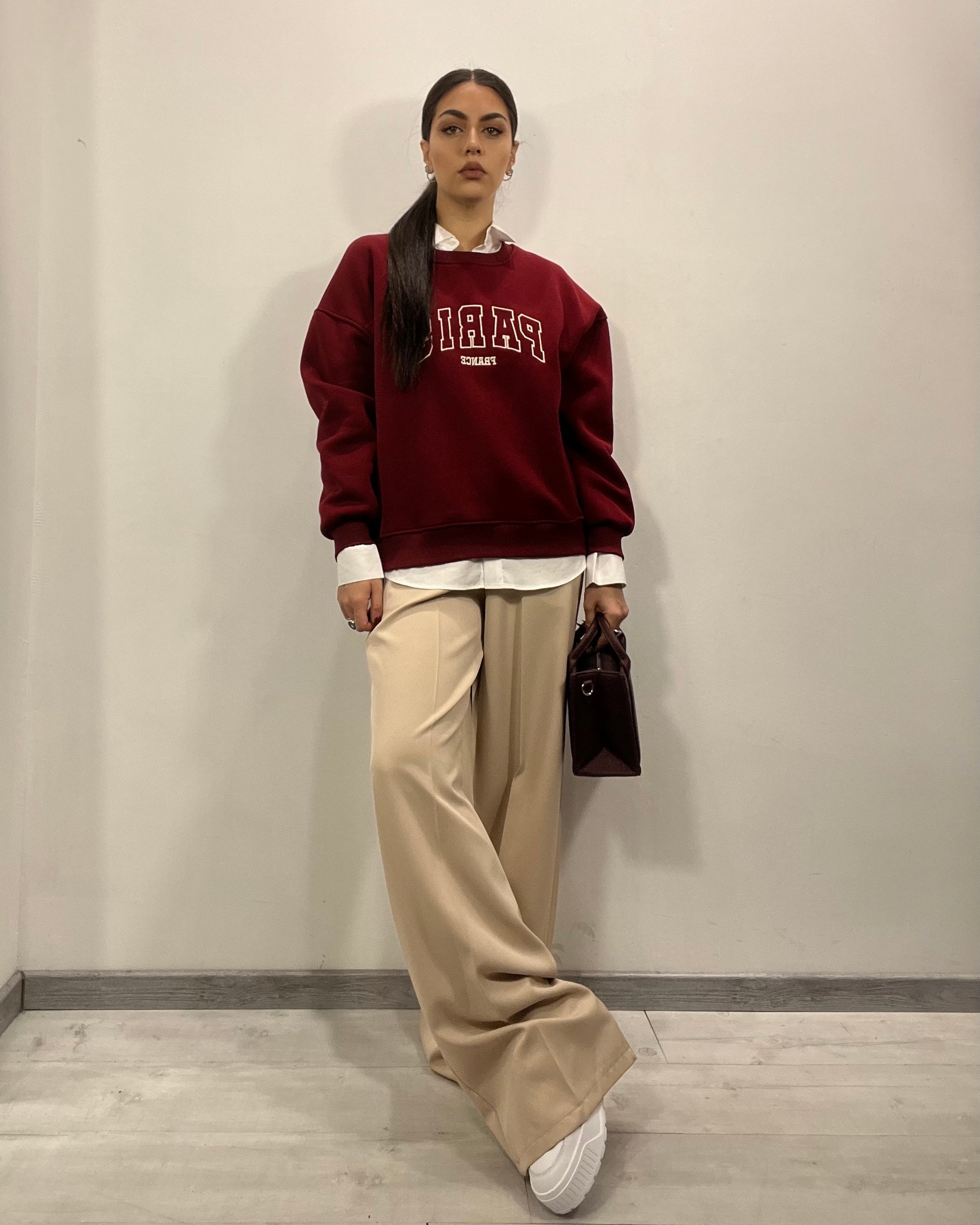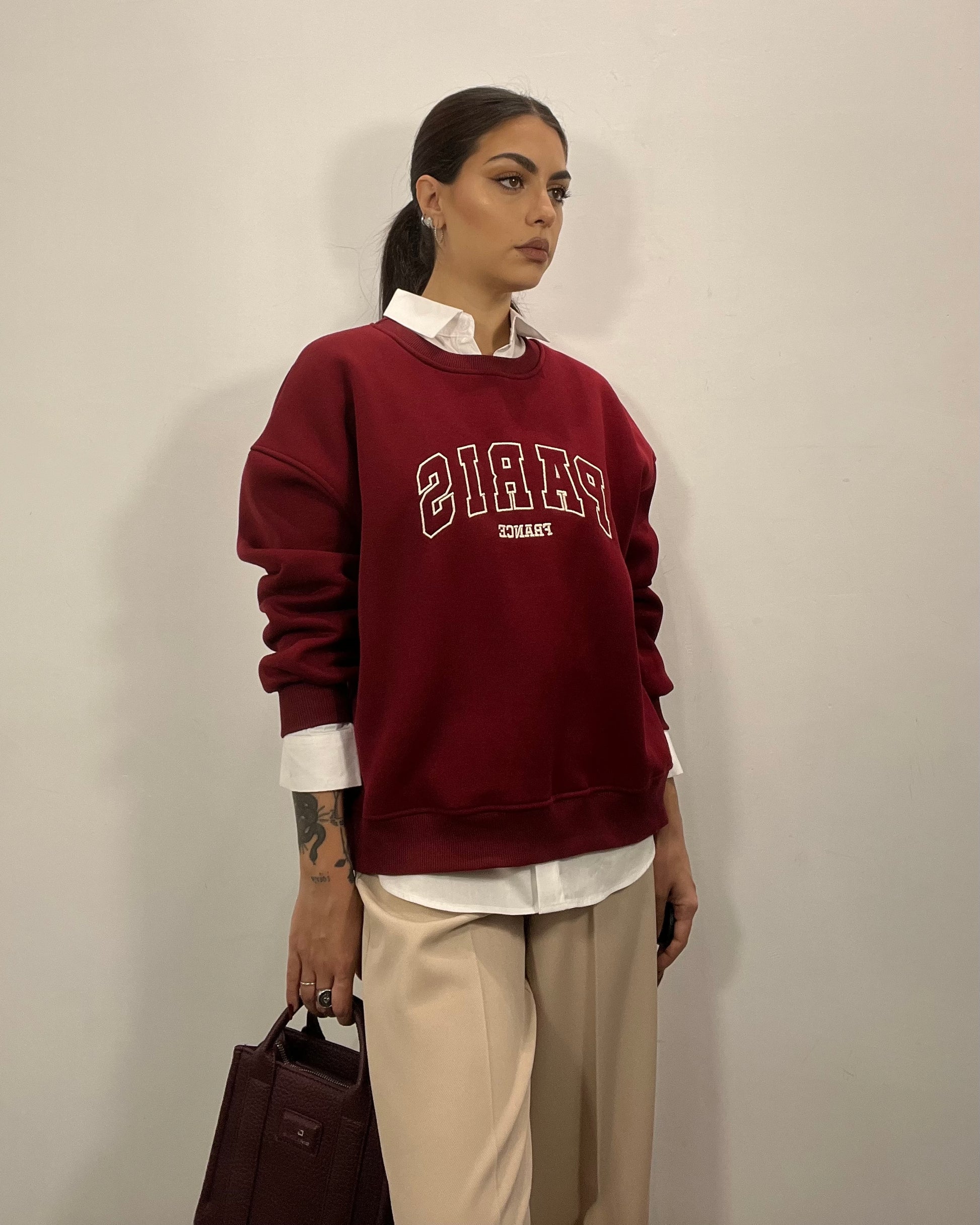 Felpa Paris senza cappuccio by Lumina con scritta ricamata base bordeaux e scritte panna, interno in pile disponibile in taglia unica