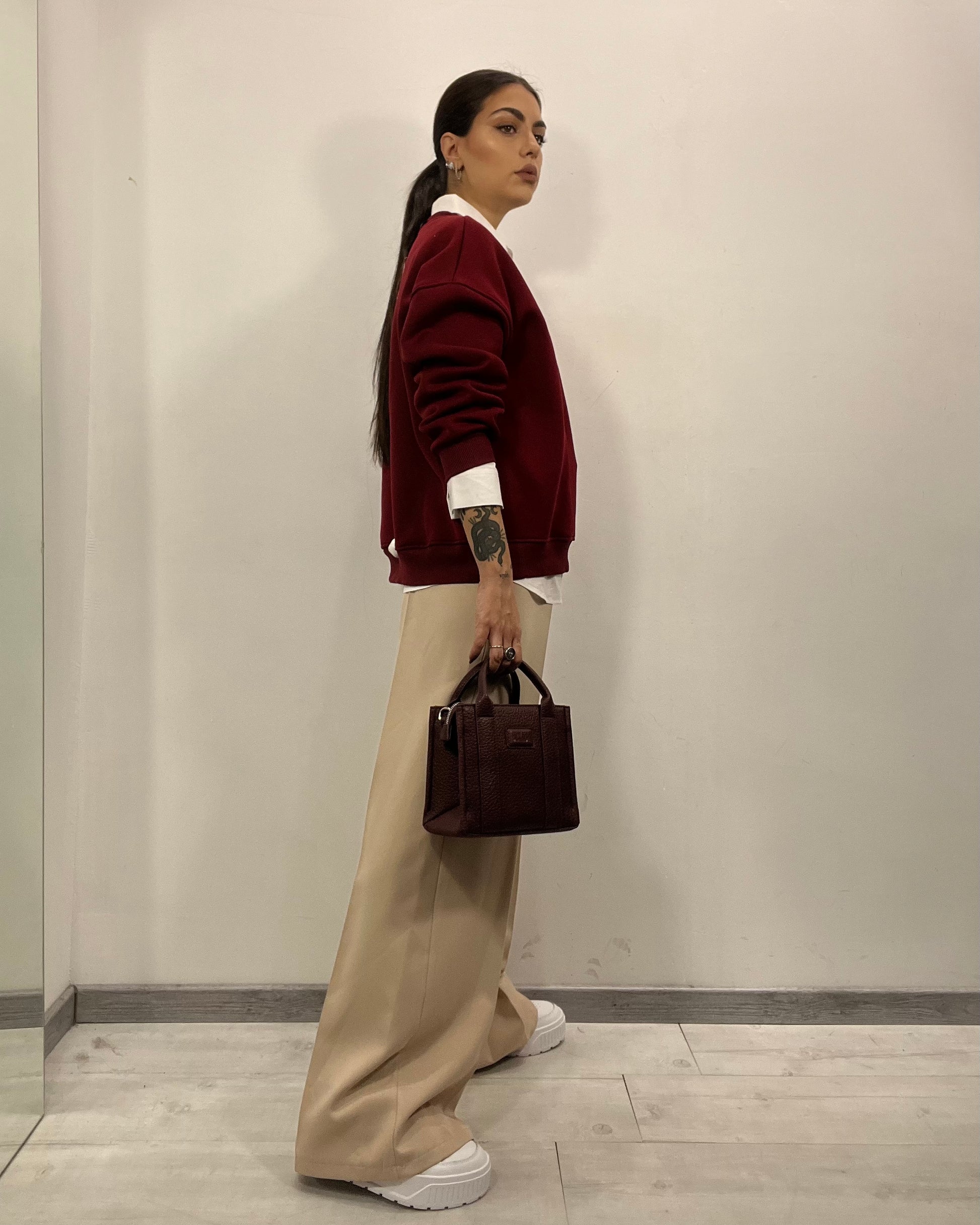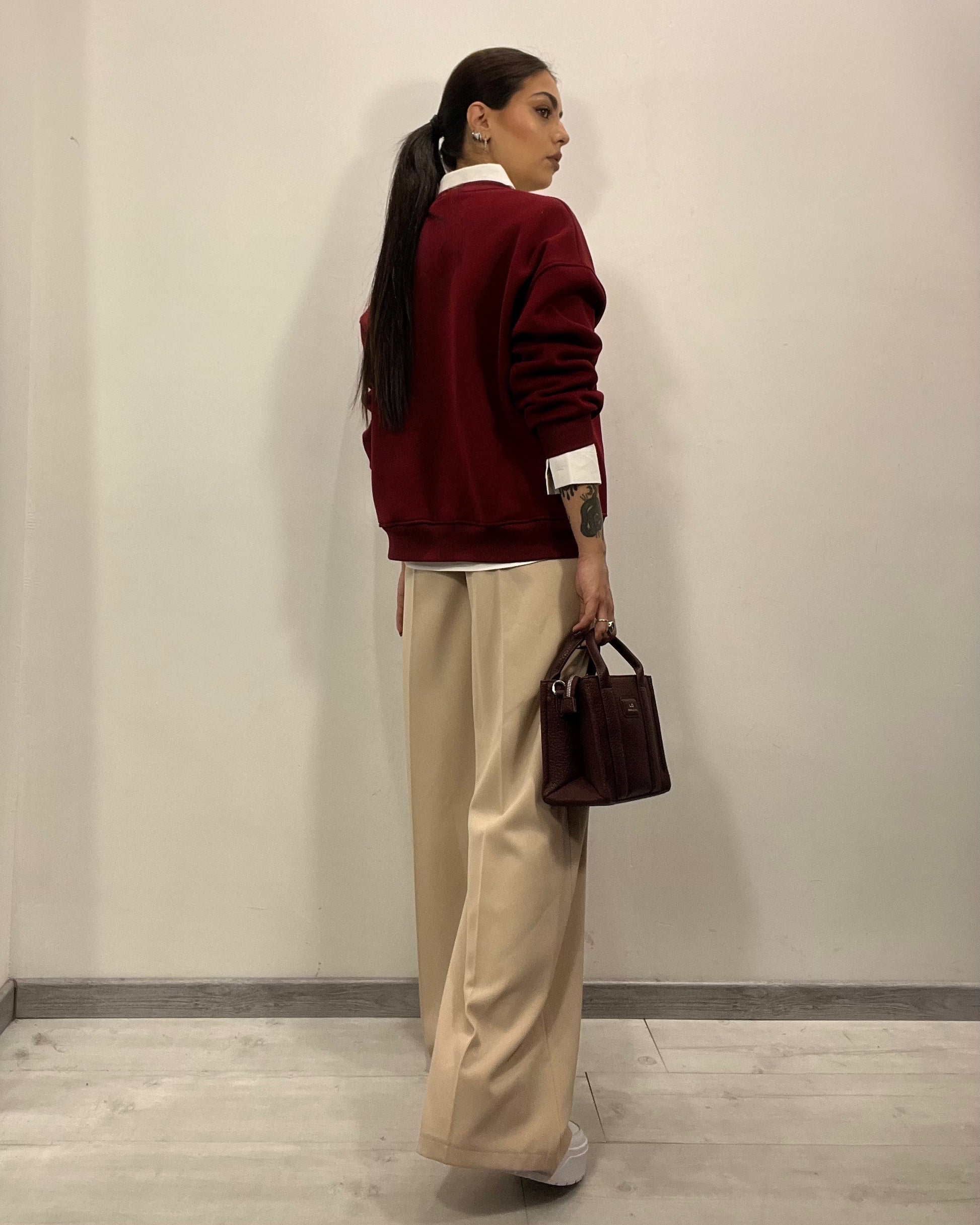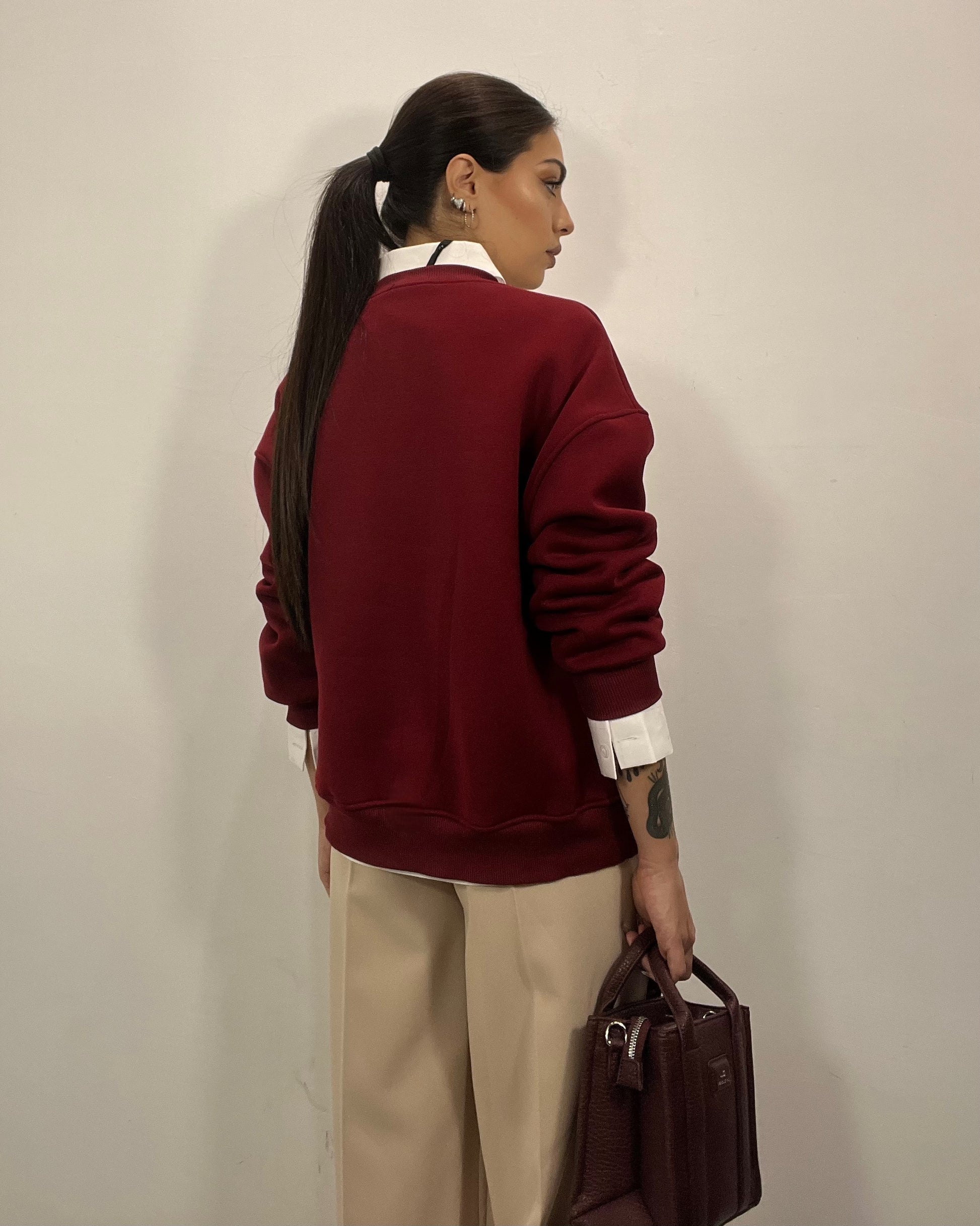 Felpa Paris senza cappuccio by Lumina con scritta ricamata base bordeaux e scritte panna, interno in pile disponibile in taglia unica