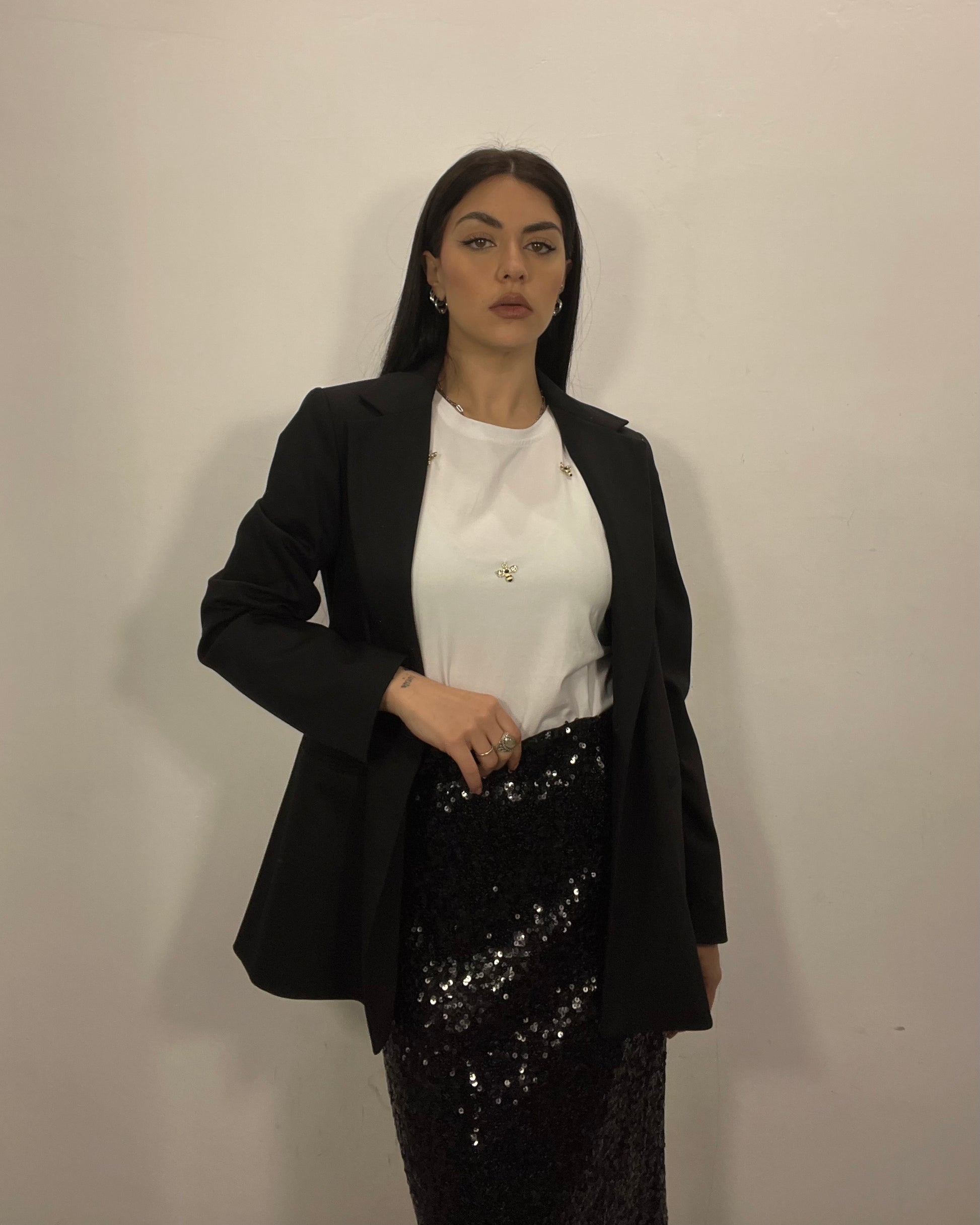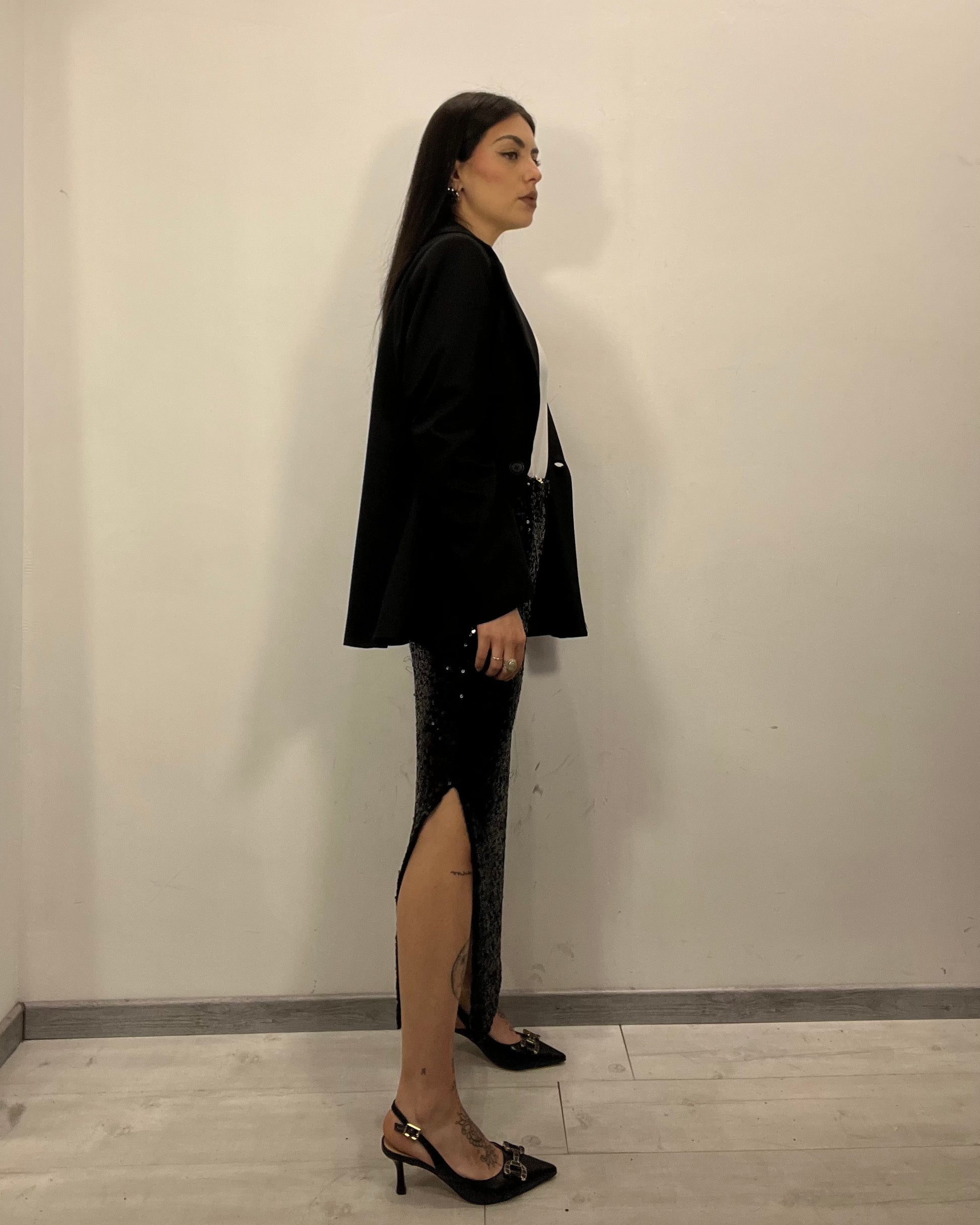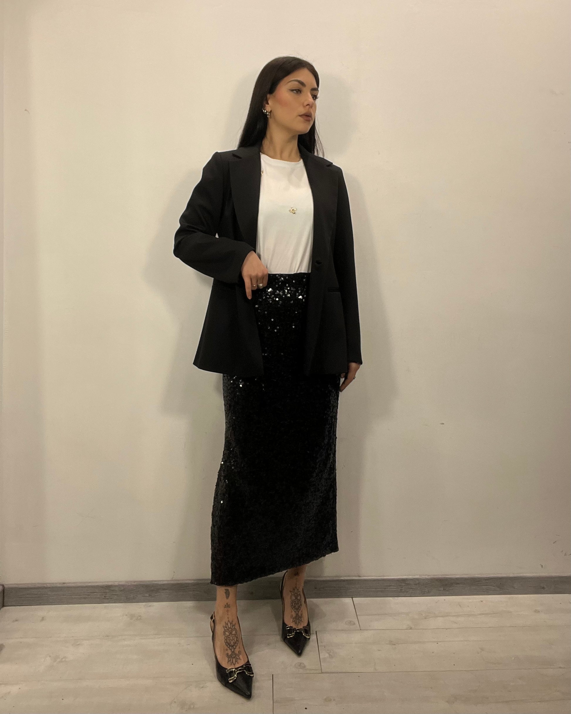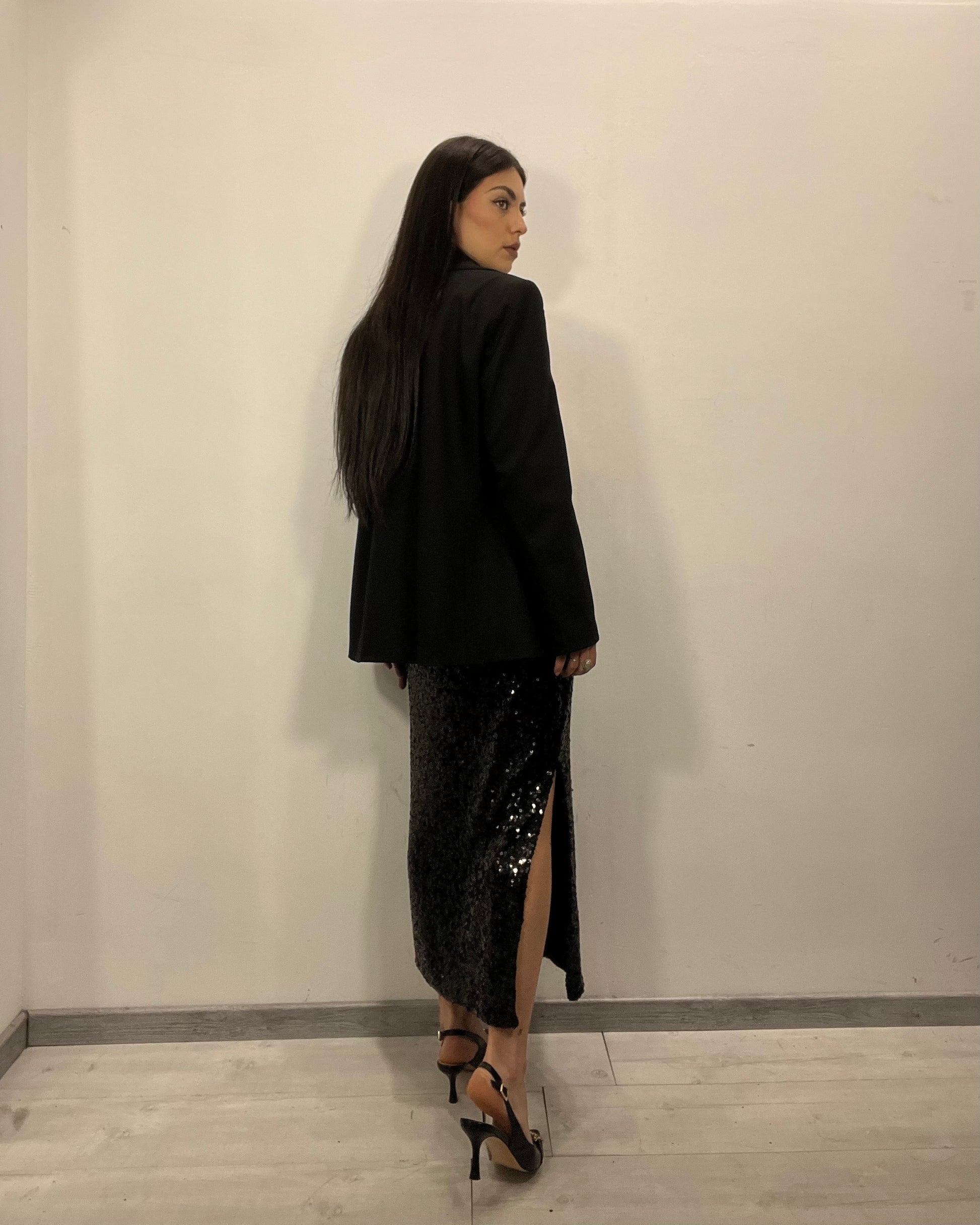 Gonna tubolare in paillettes nera con spacco laterale disponibile in taglia unica vestibilità S/L