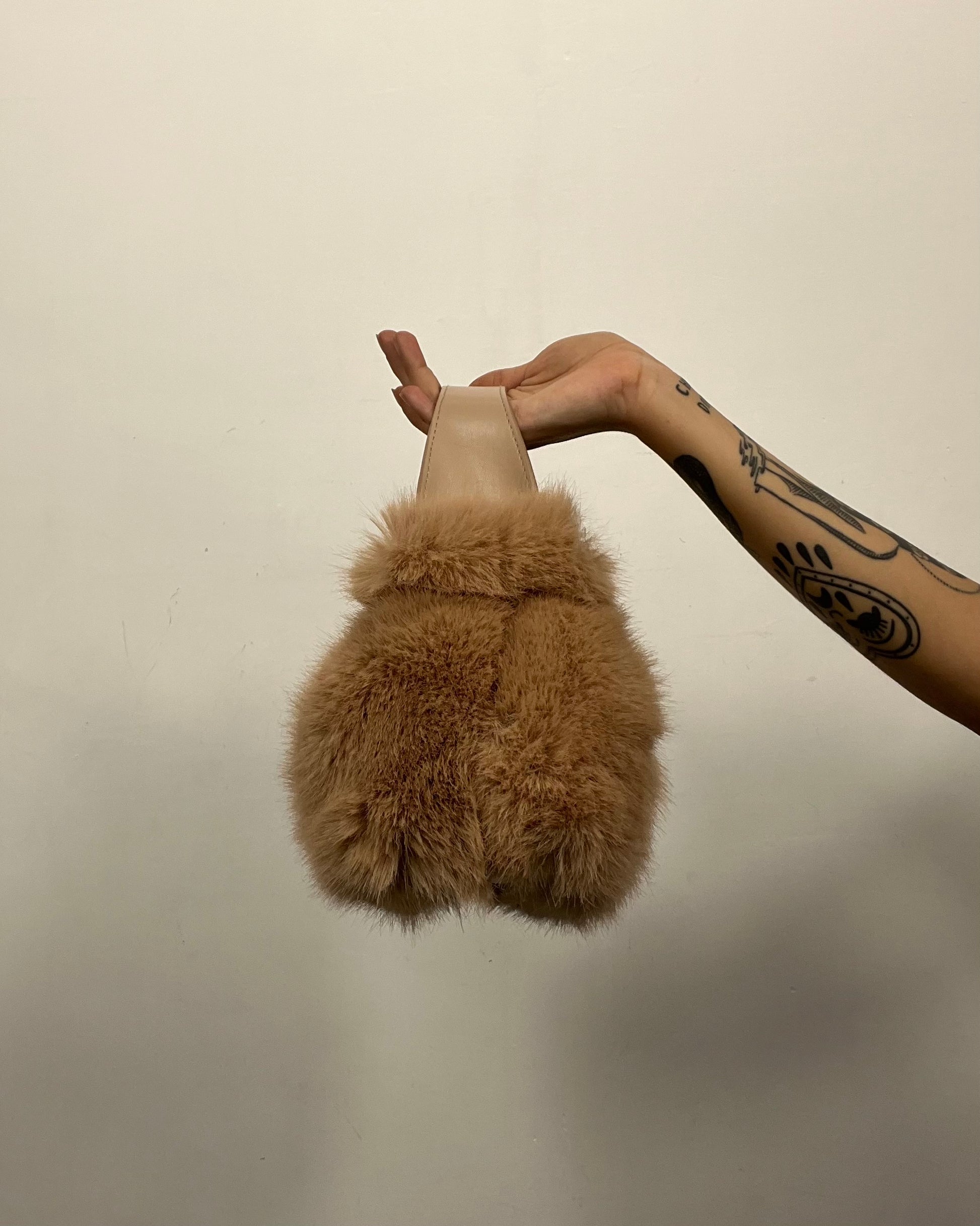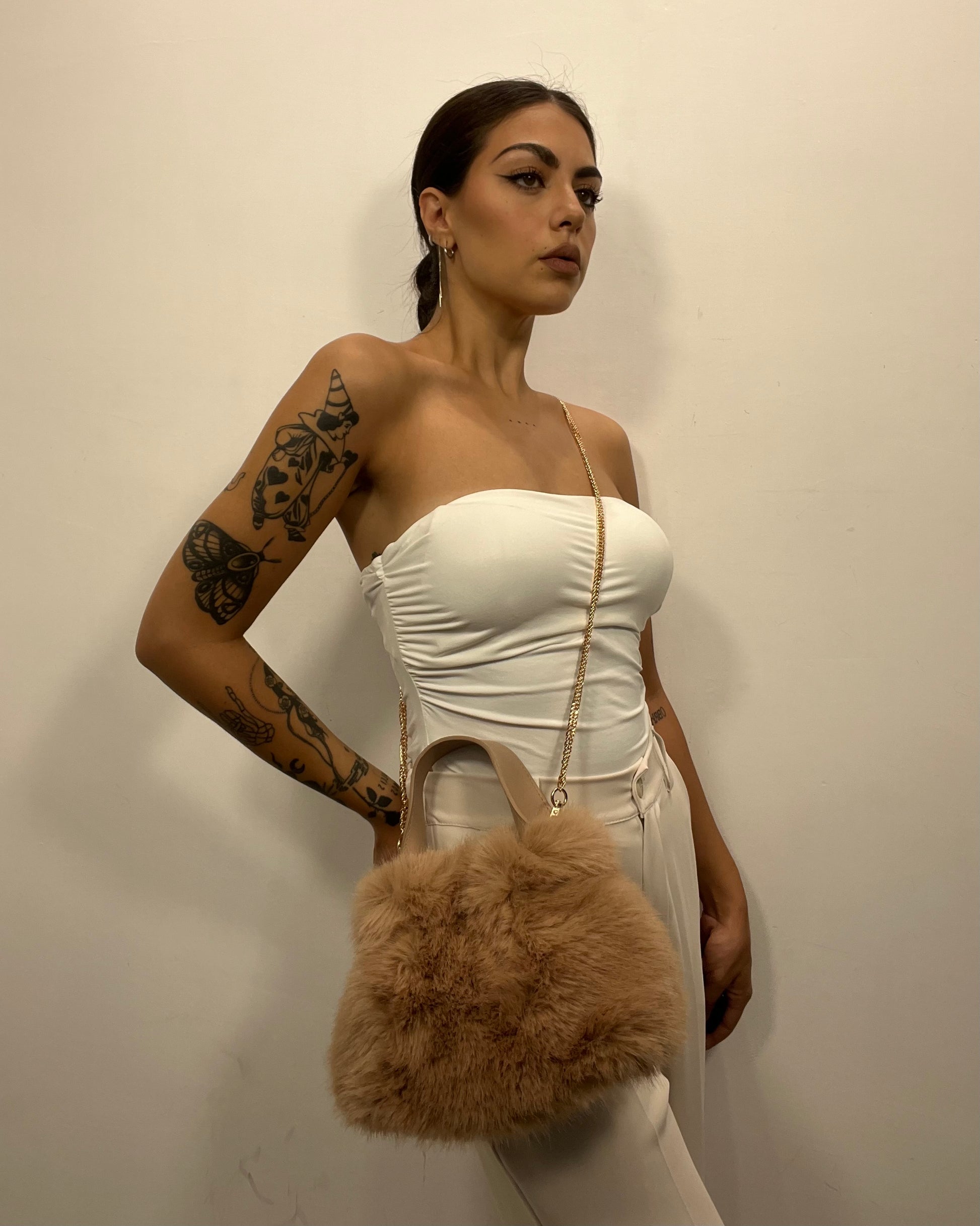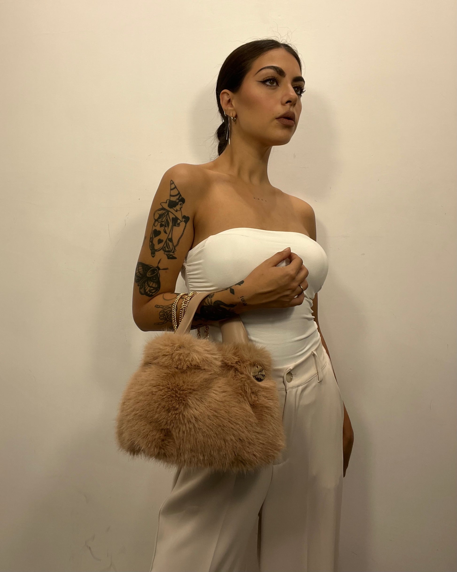 Minibag in eco pelliccia e manico in ecopelle. Dotata di tracolla a catenina oro. Disponibile in due fantasie e quattro colori. Misure: 29x28h