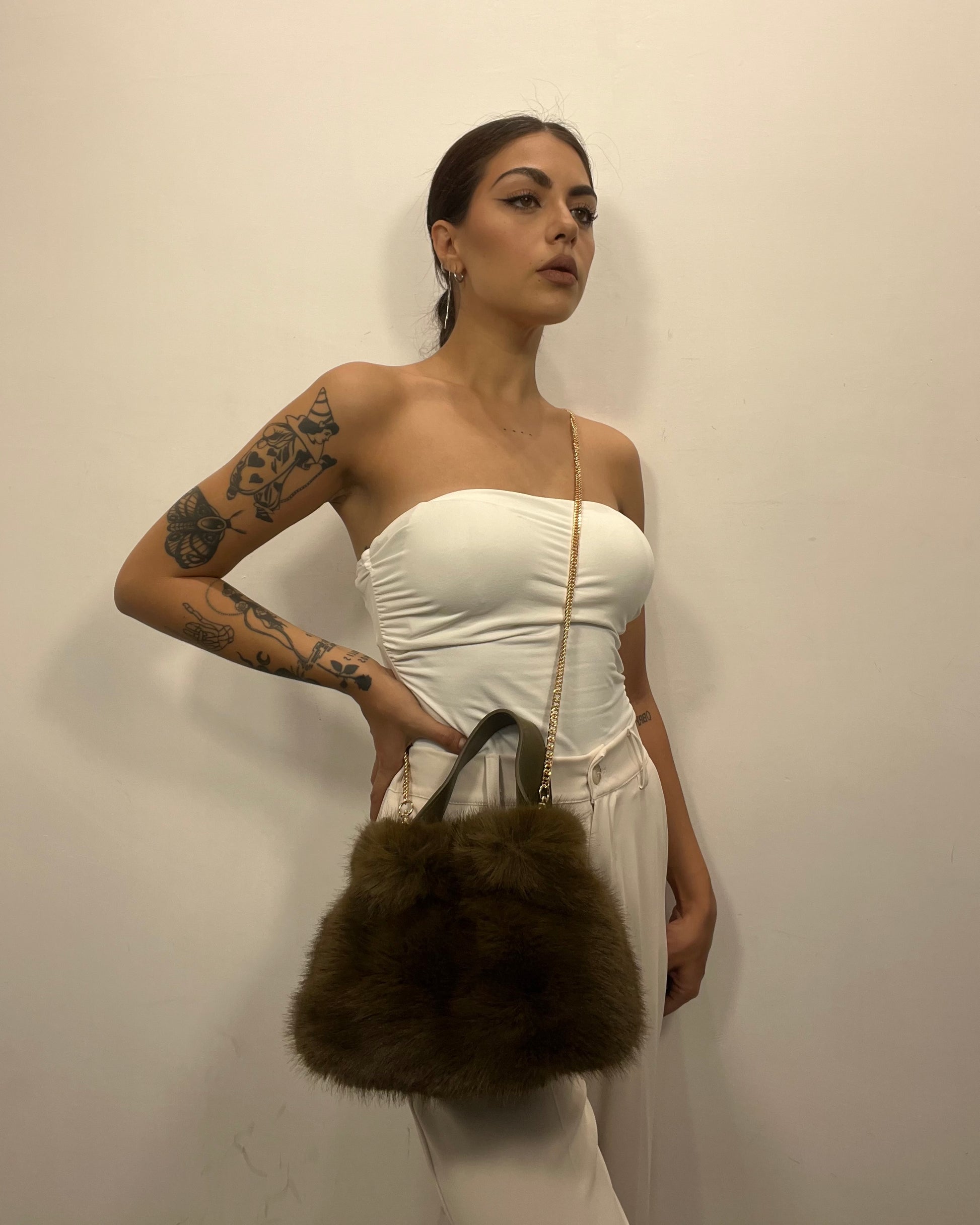 Minibag in eco pelliccia e manico in ecopelle. Dotata di tracolla a catenina oro. Disponibile in due fantasie e quattro colori. Misure: 29x28h