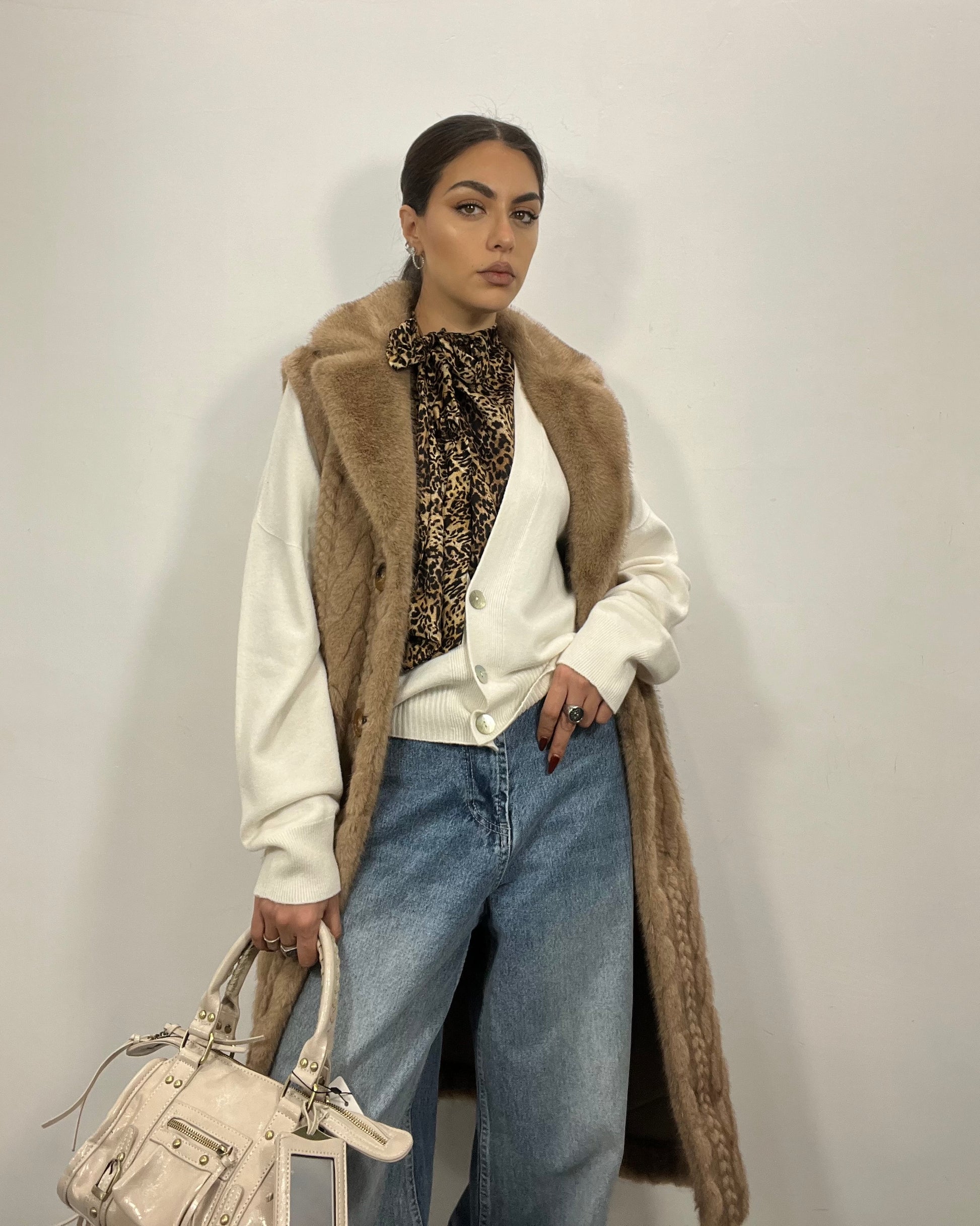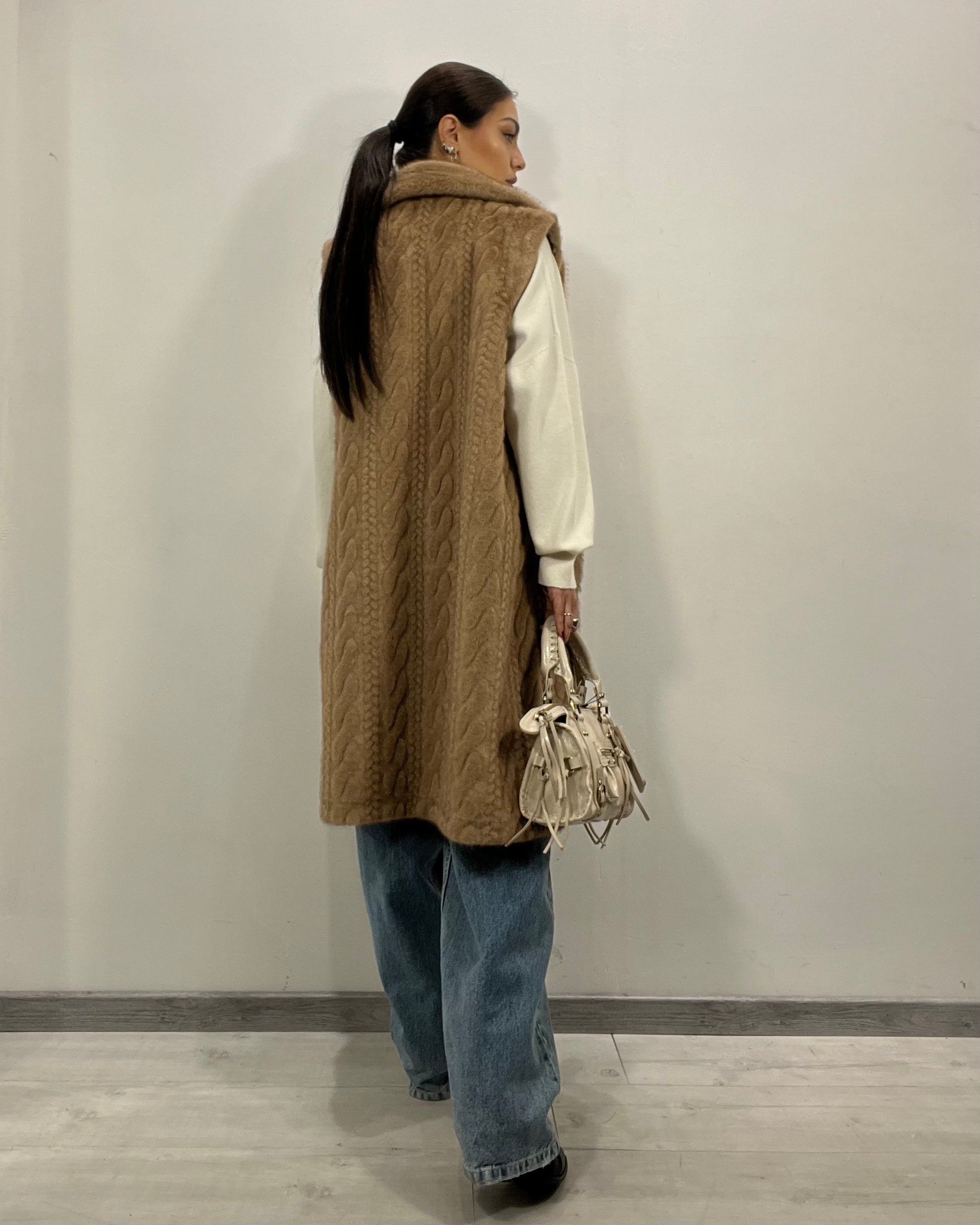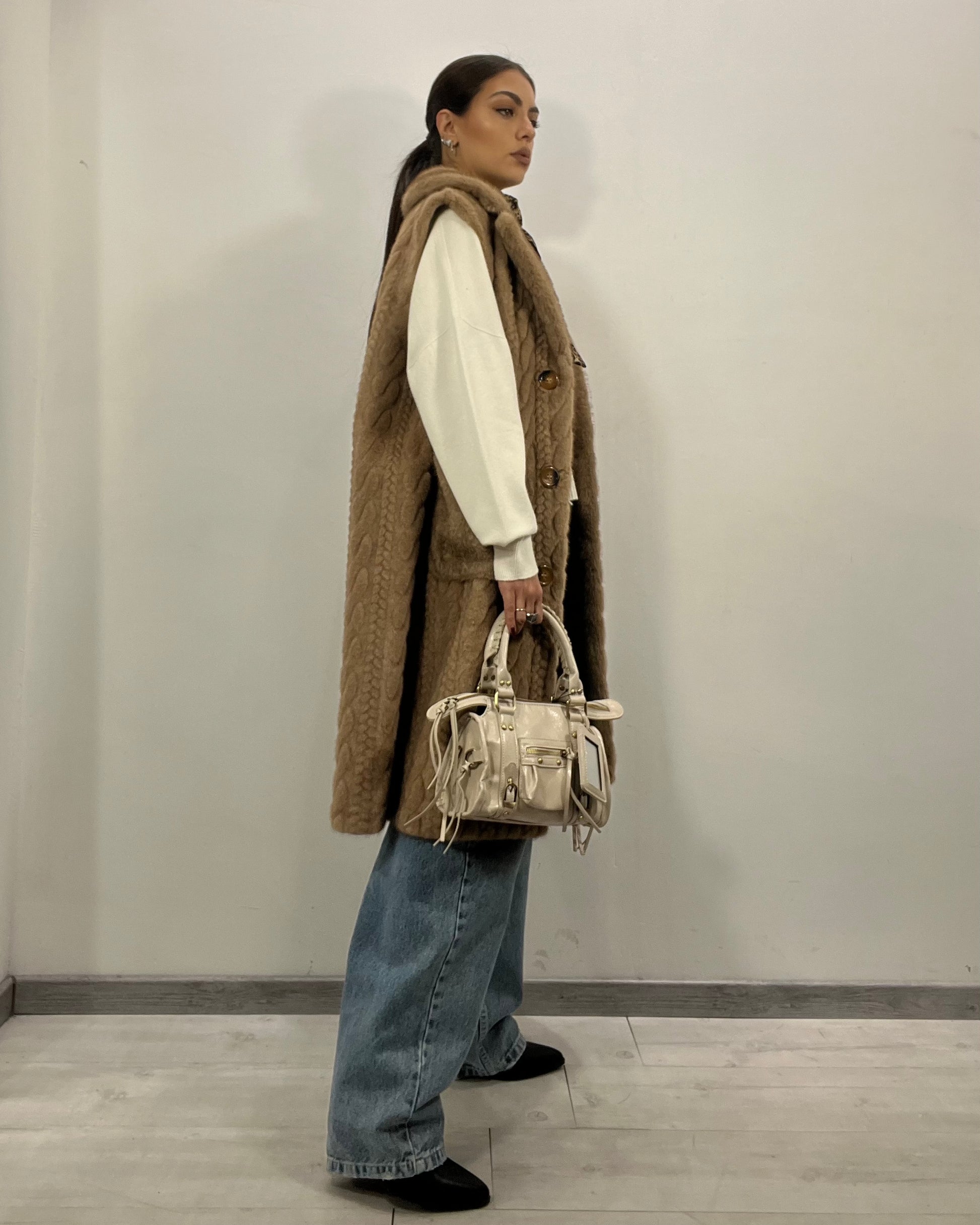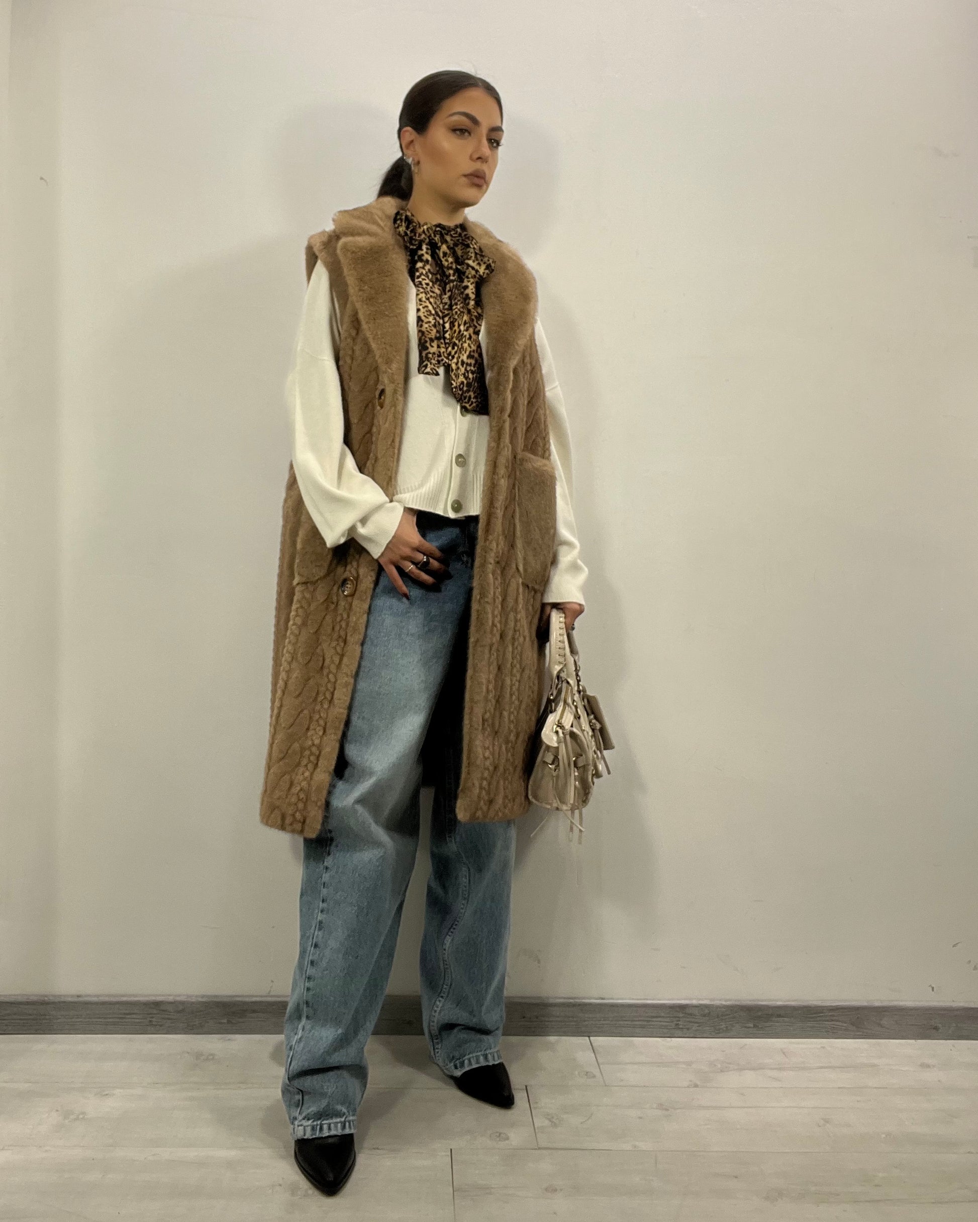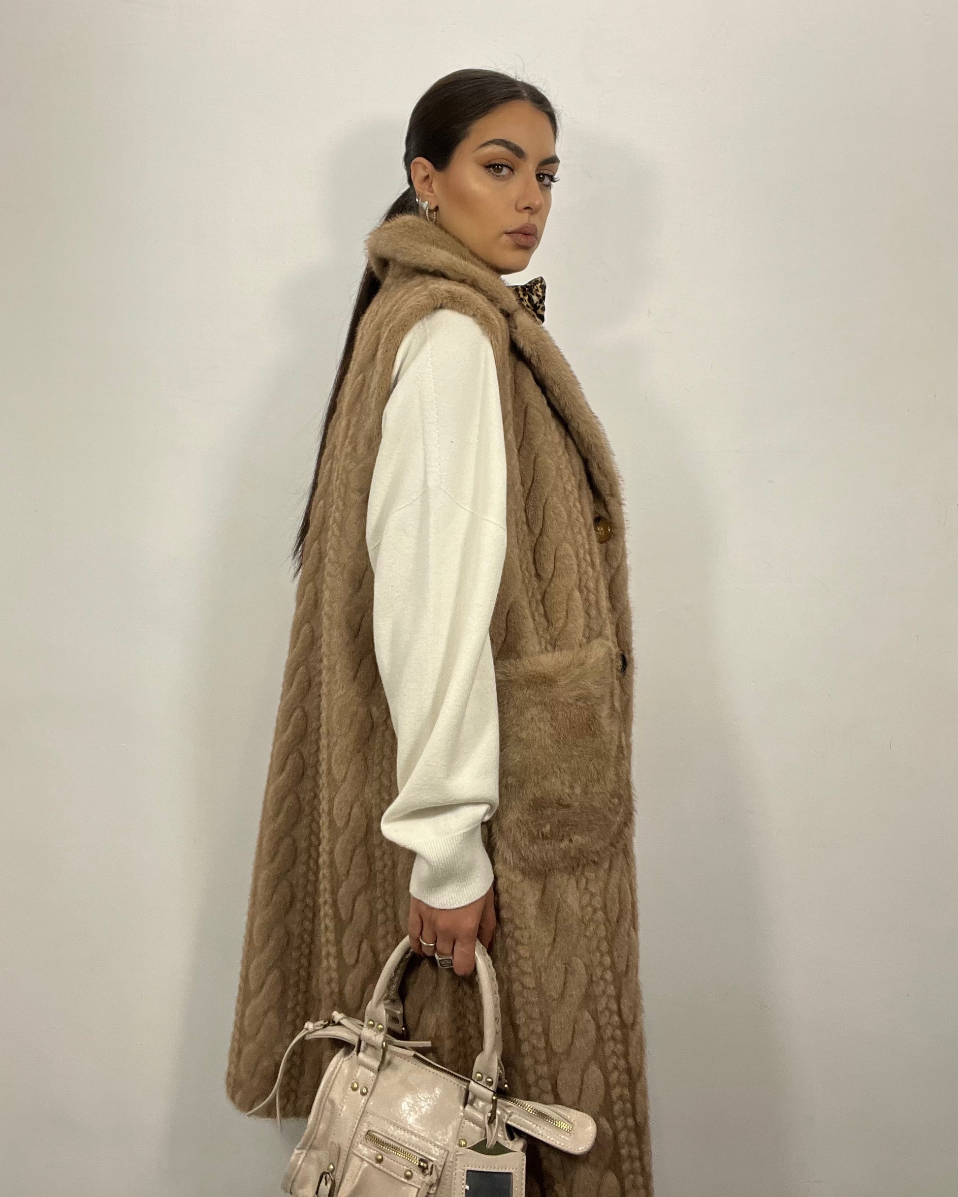 Smanicato in ecopelliccia con trama a trecce. Scollo giacca, tasche frontali 3 bottoni. Disponibile in taglia unica